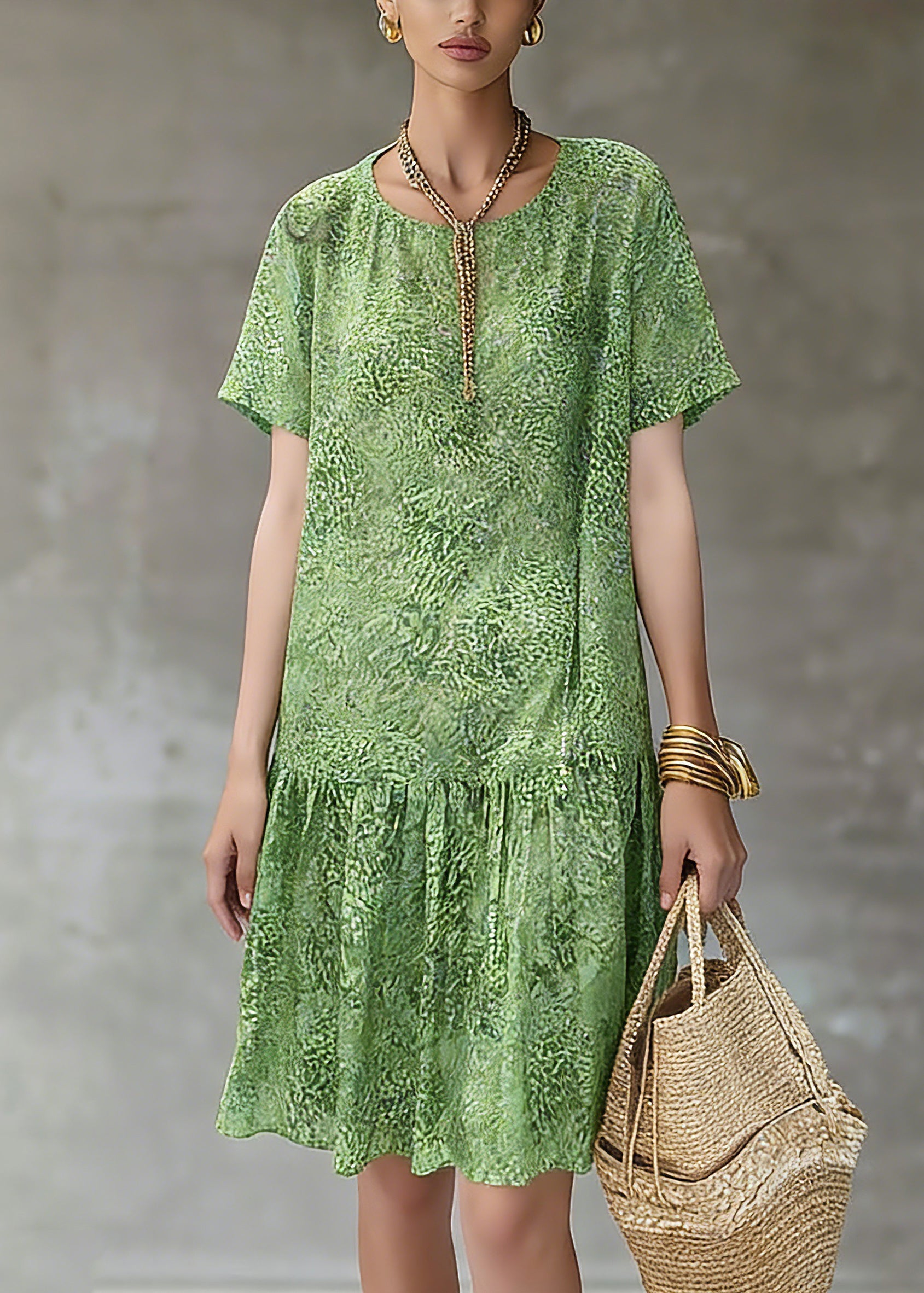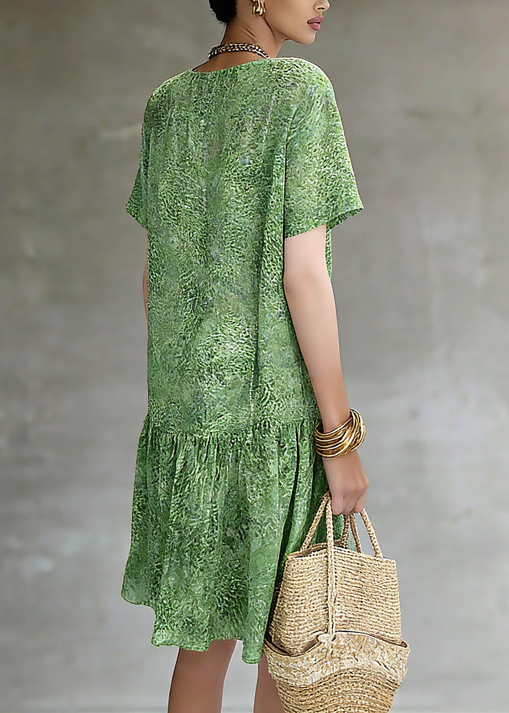 Natural Green Print Patchwork Long Dresses Short Sleeve