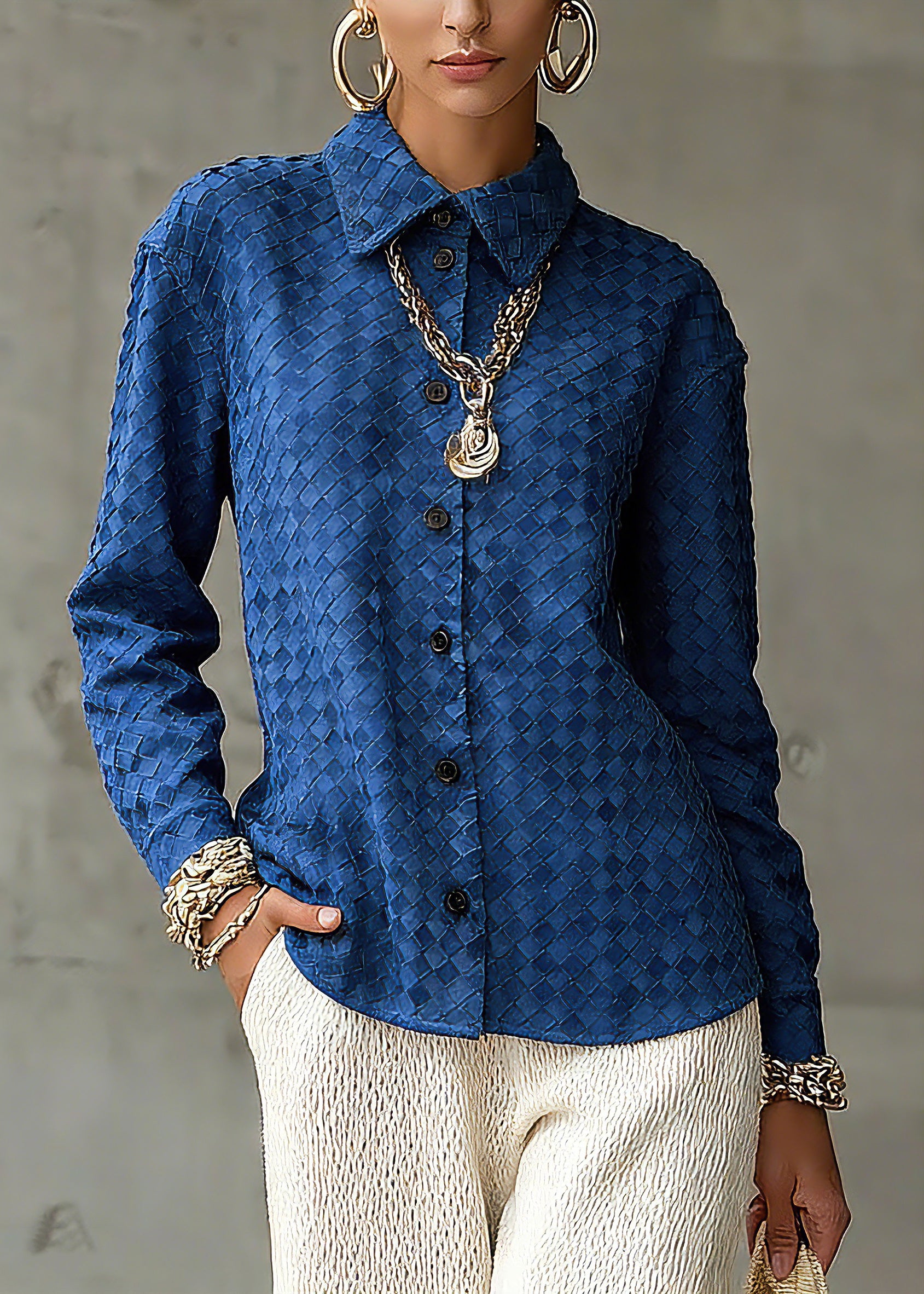 Unique Blue Peter Pan Collar Plaid Button Faux Suede Shirt Spring