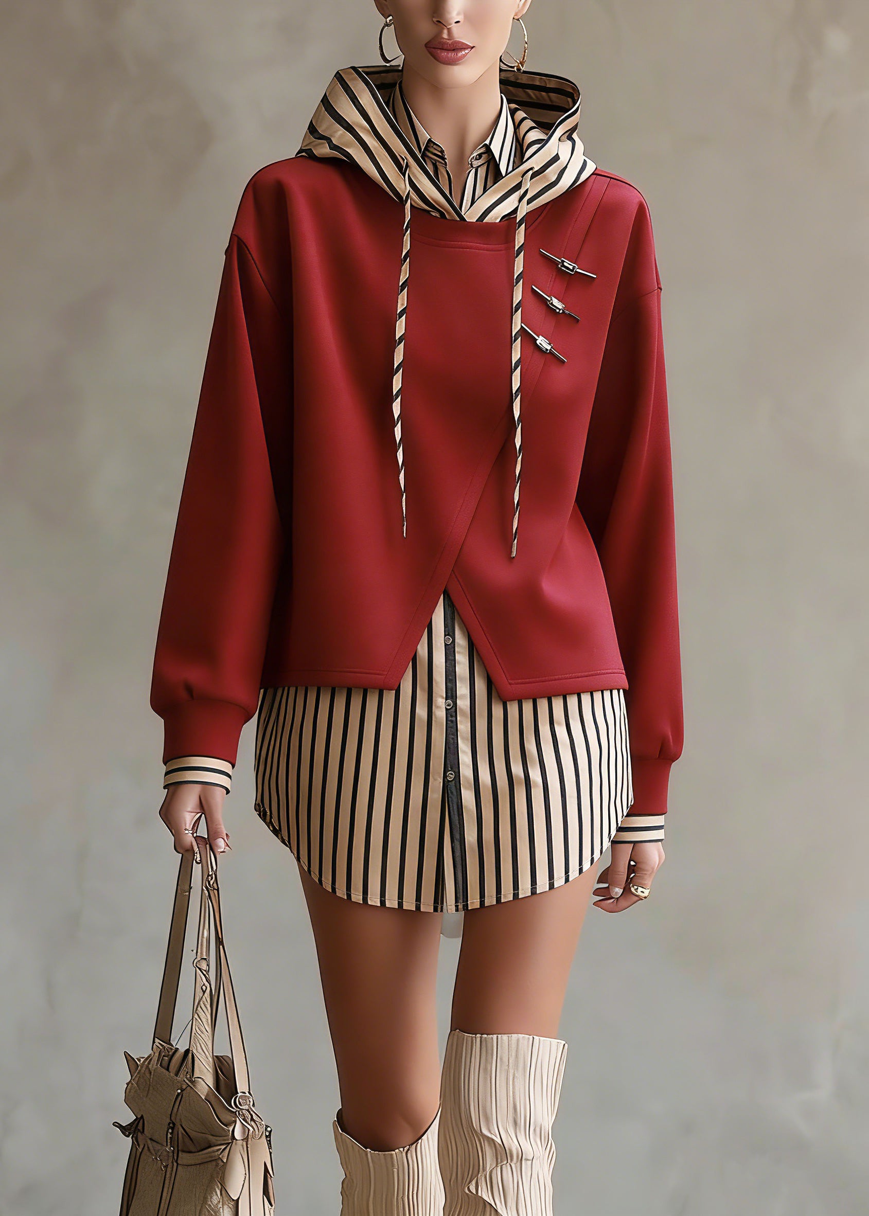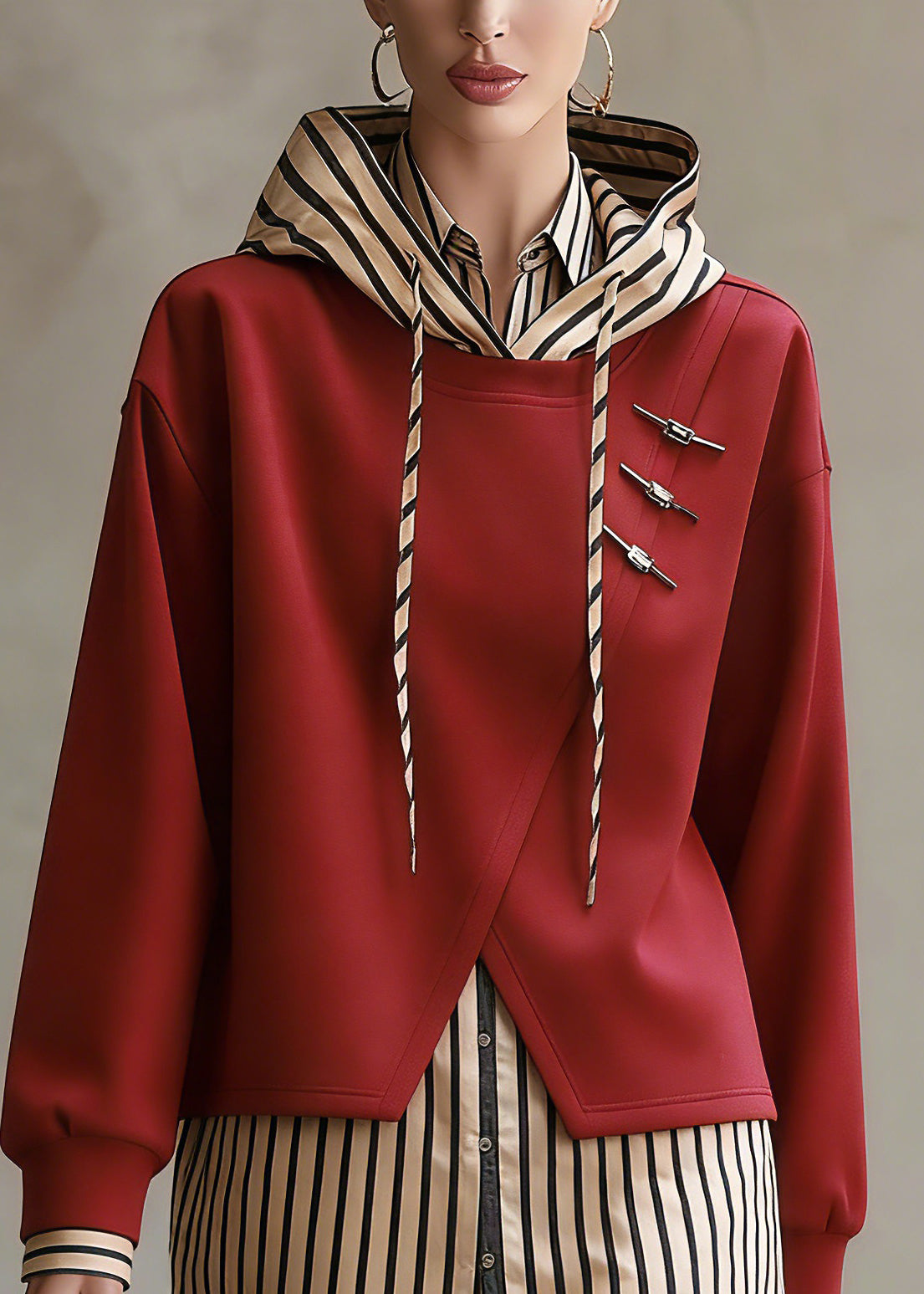 Unique Red Hooded Patchwork False Two Pieces Cotton Top Fall