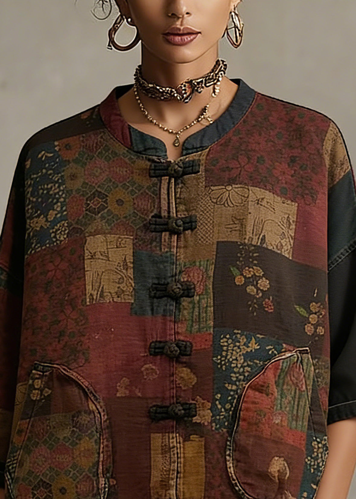 Vintage Print Button Patchwork Cotton Coat Long Sleeve