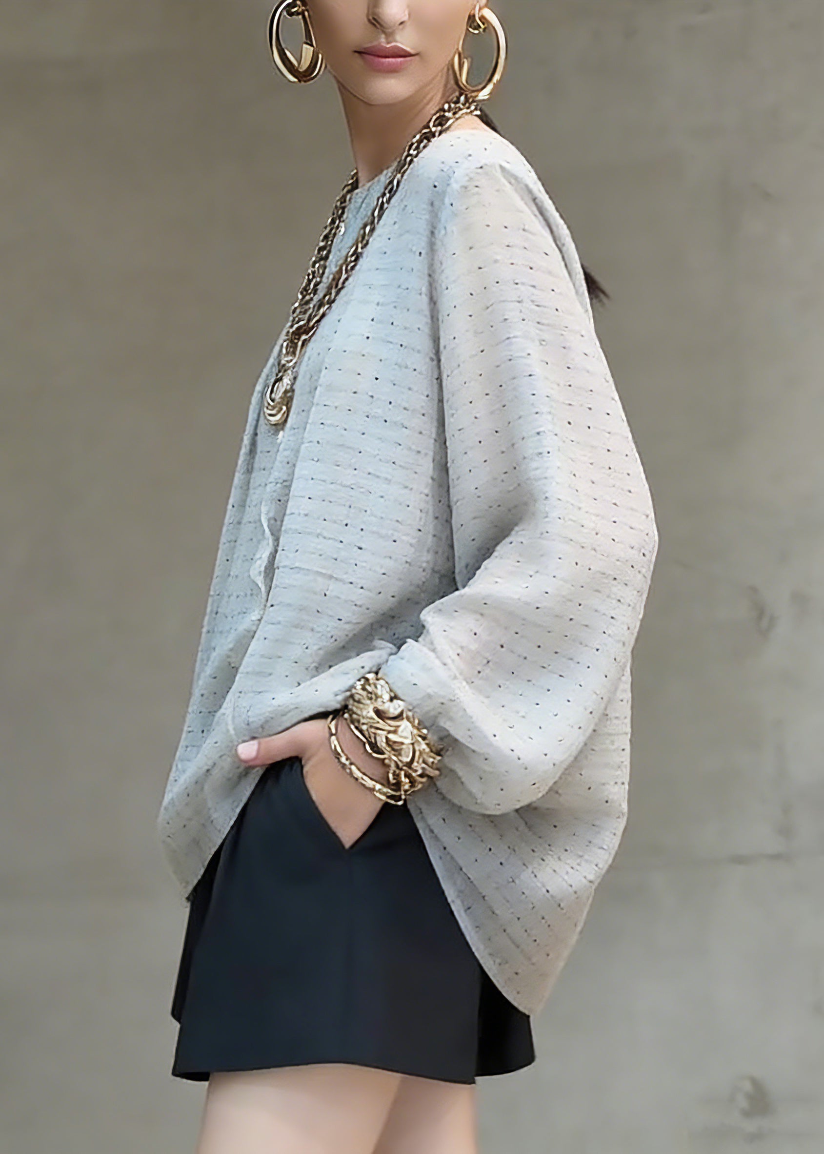 Women Grey Dot Print Top Lantern Sleeve