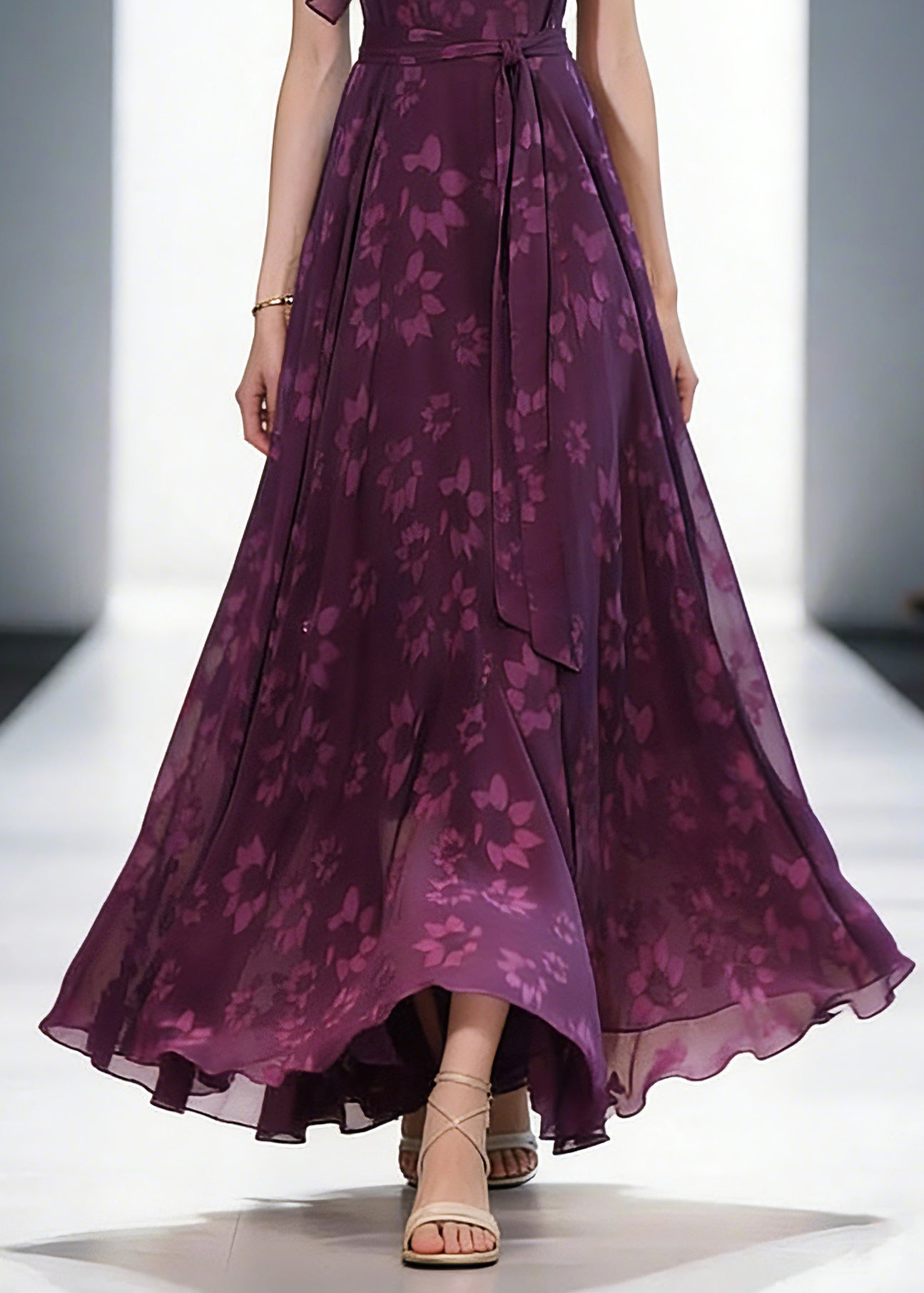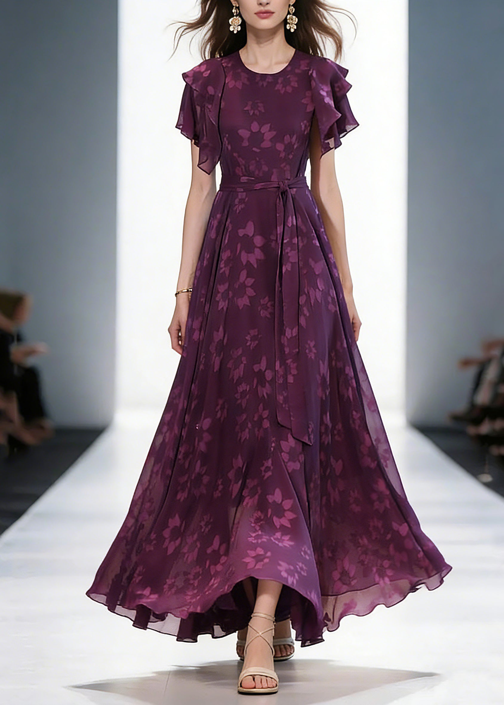Women Purple O-Neck Print Ruffled Wrinkled Chiffon Maxi Dress Short Sleeve