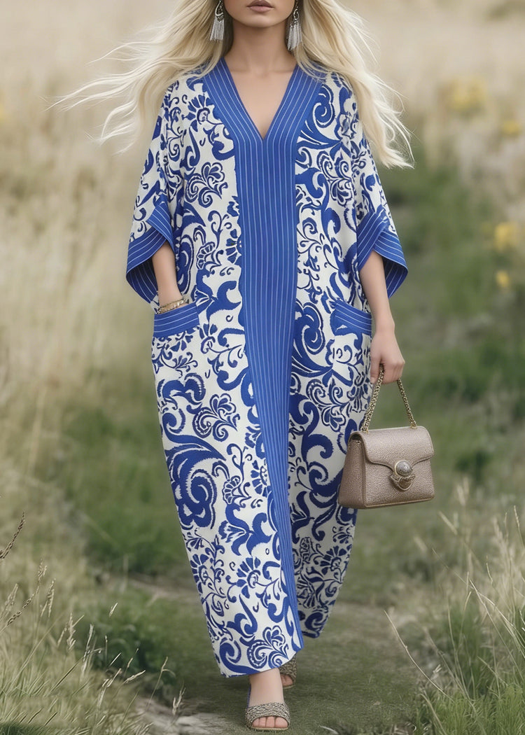 Boho Blue Oversized Print Cotton Maxi Dresses Spring