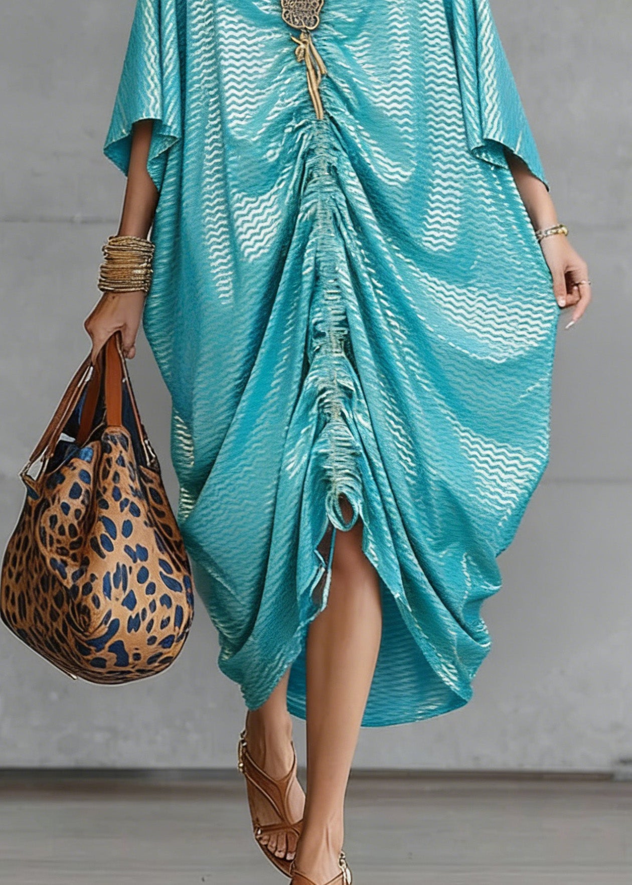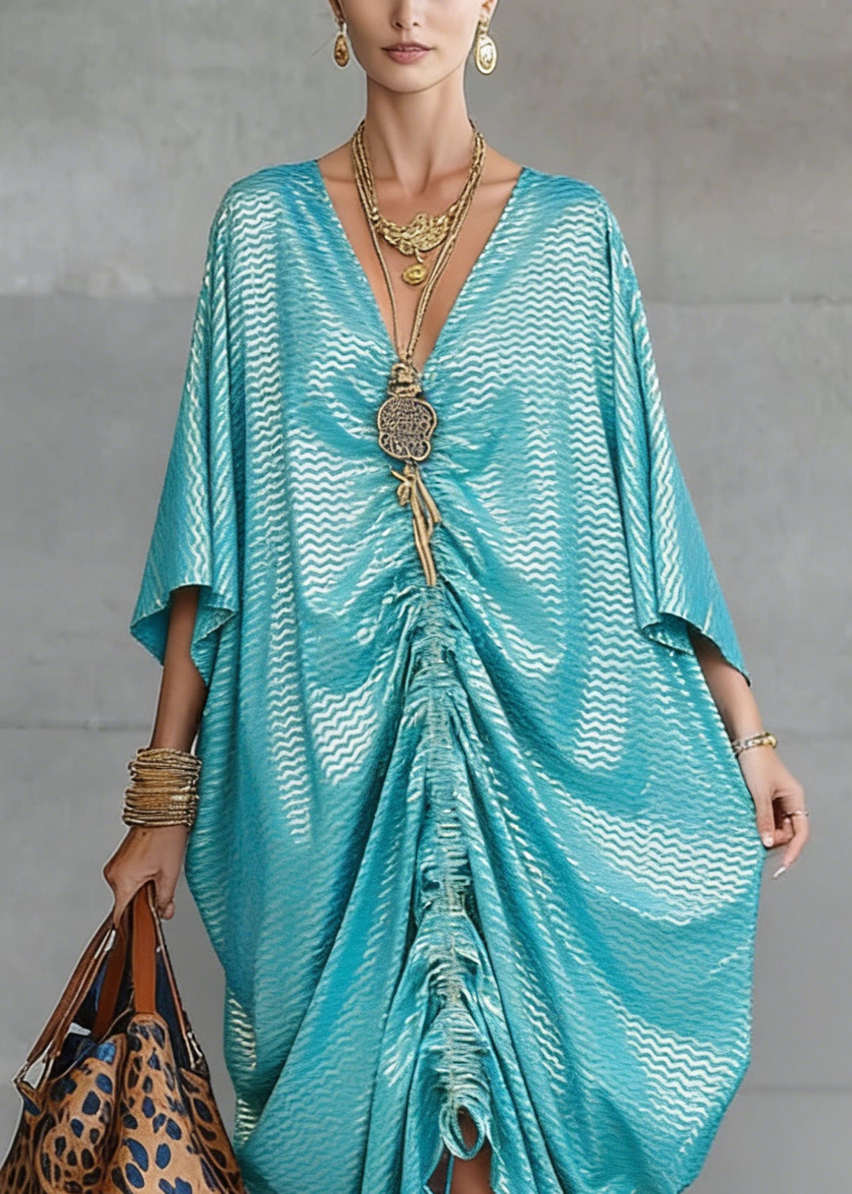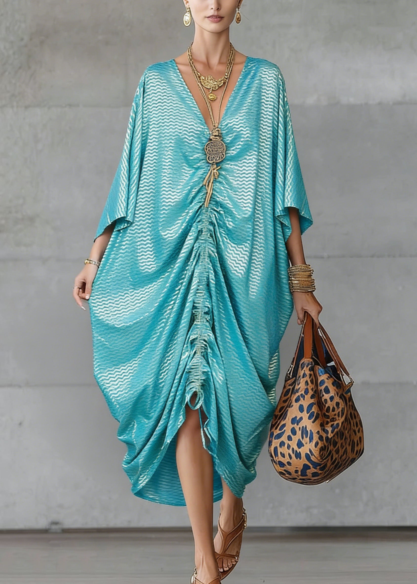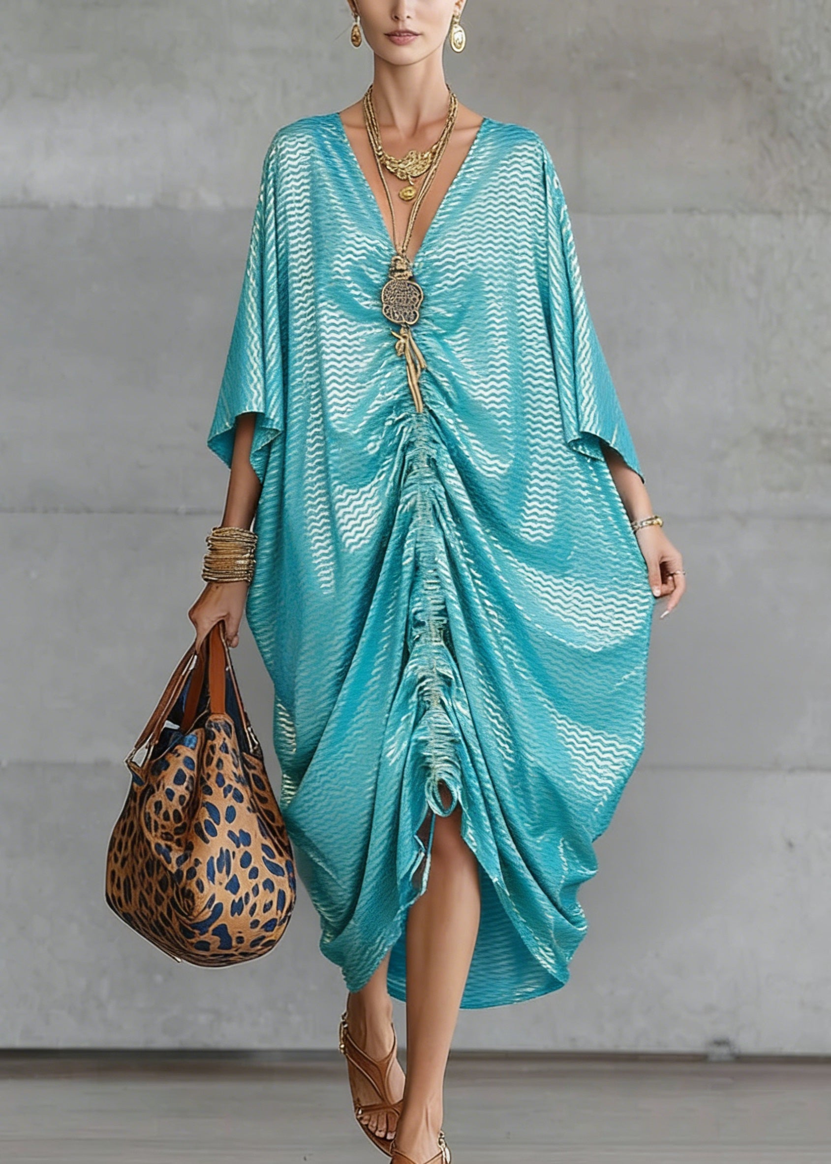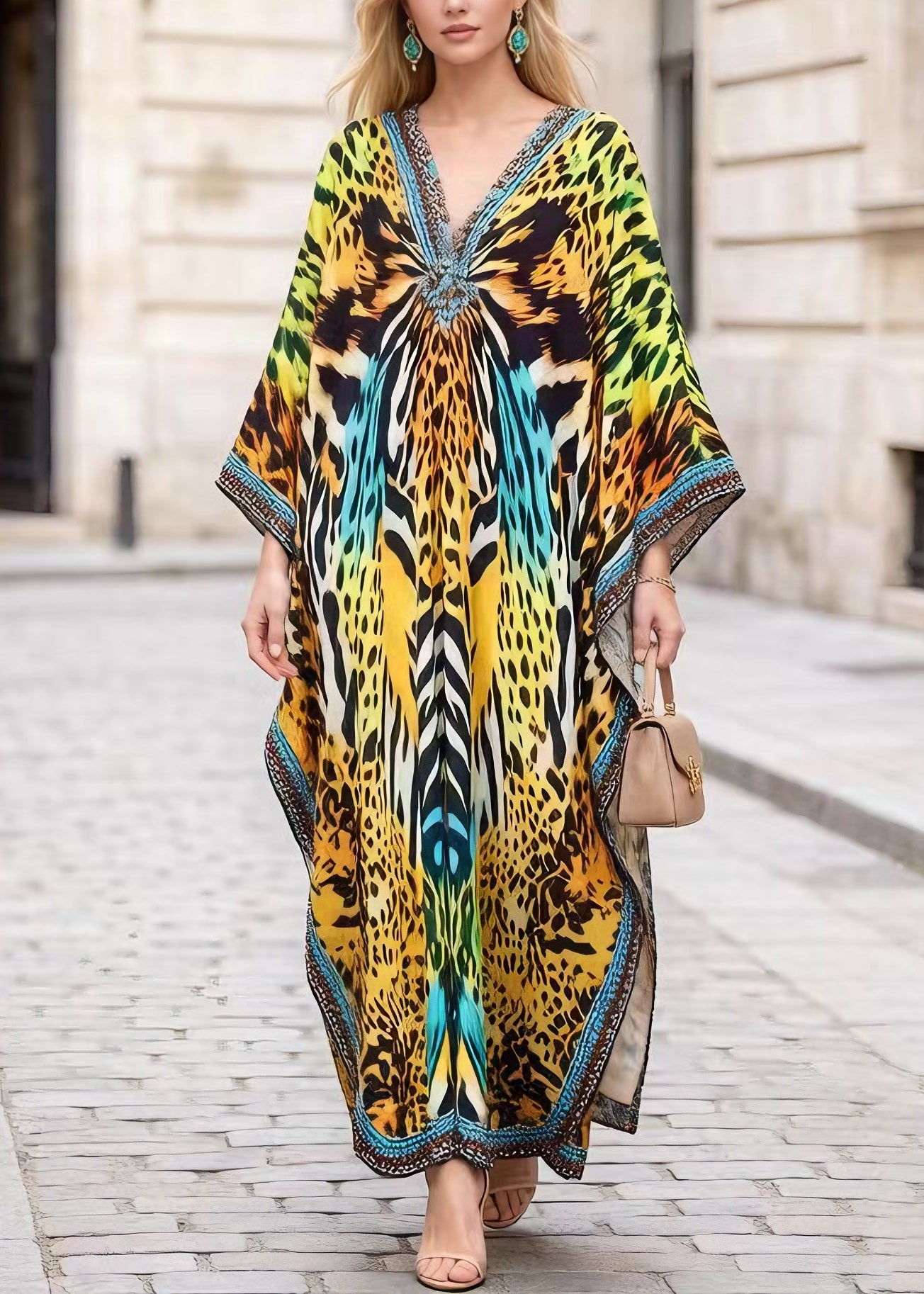 Loose V Neck Print Cotton Maxi Dresses Batwing Sleeve