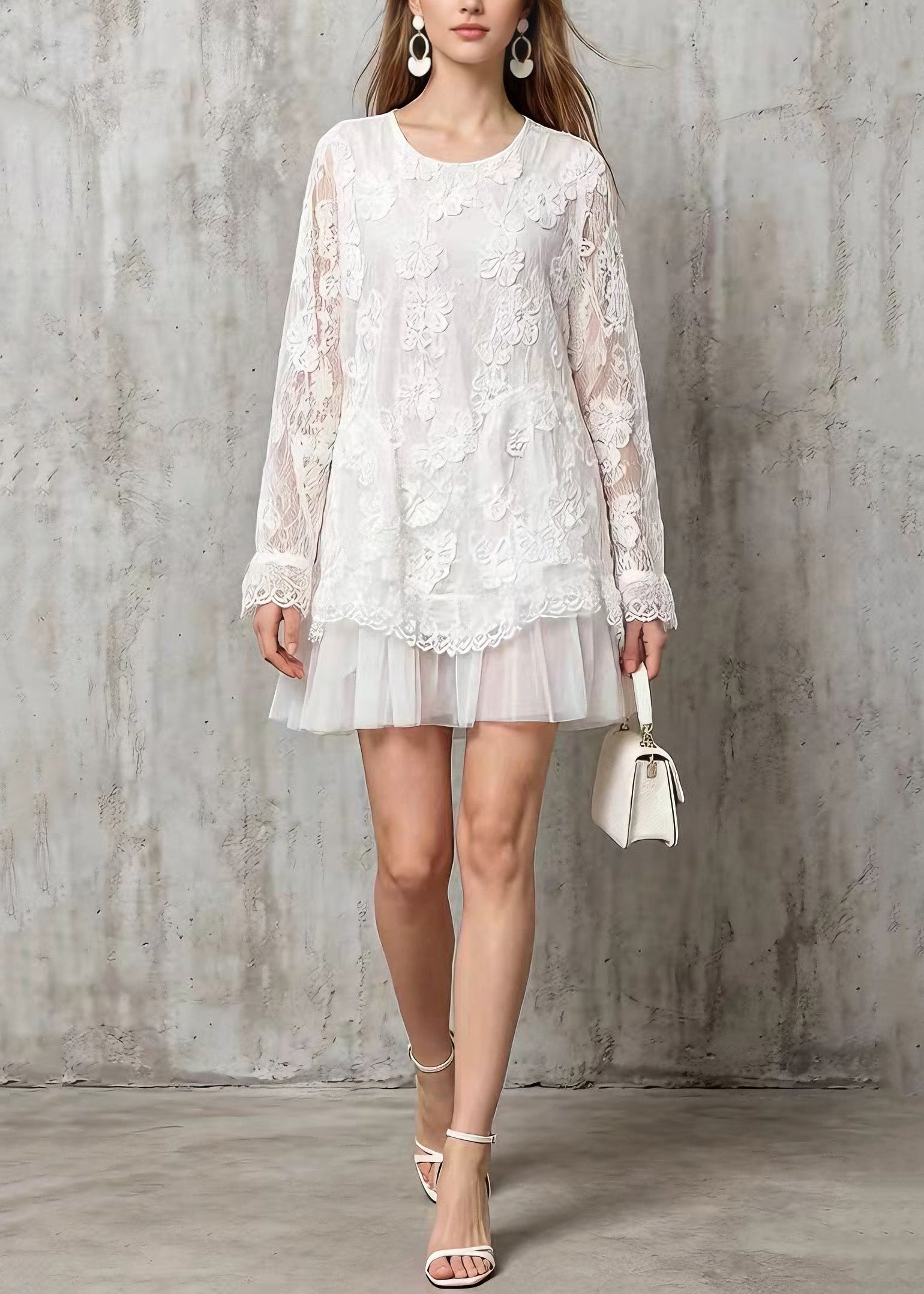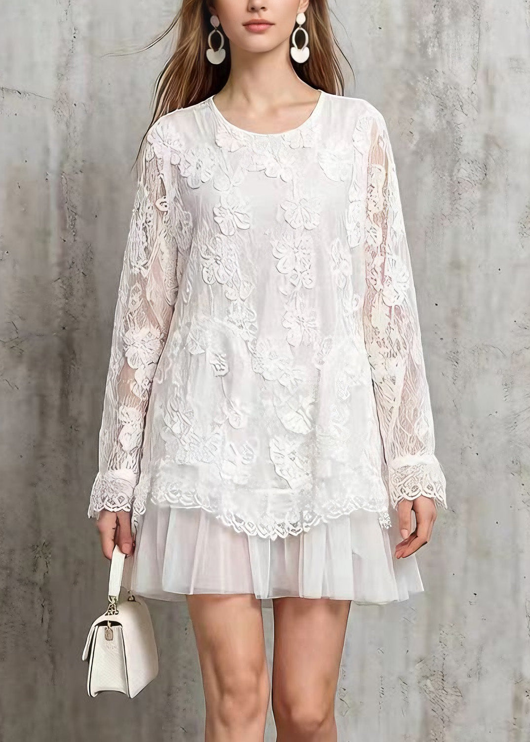 Stylish White O Neck Tulle Patchwork Lace Mid Dresses Spring