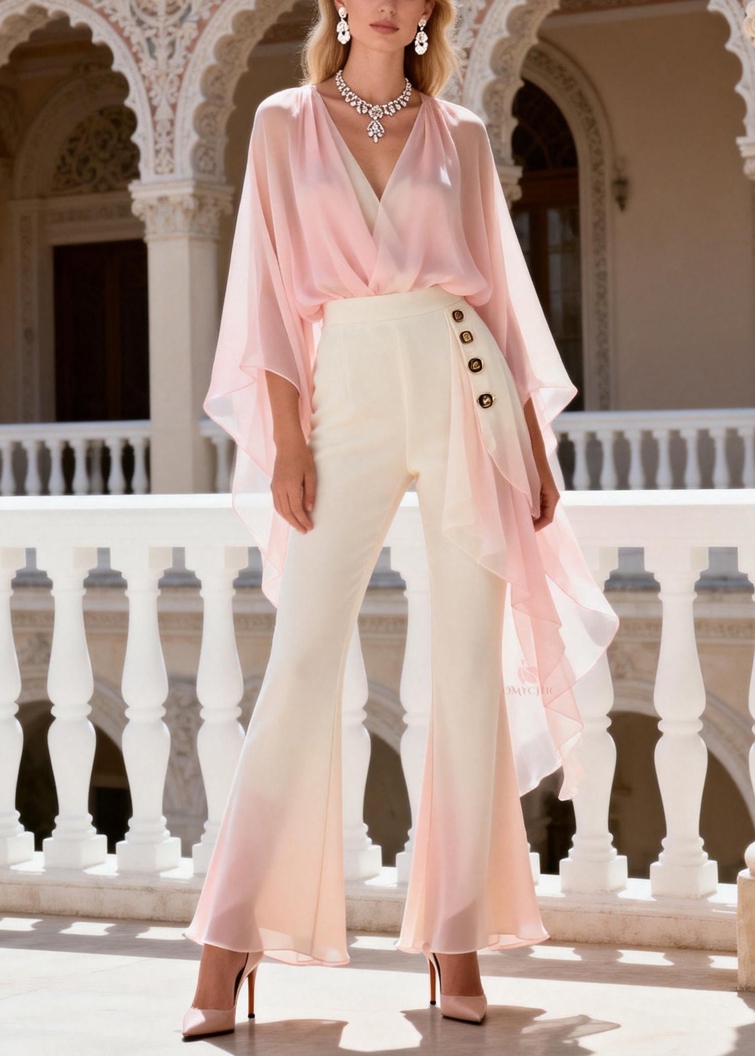 Classy V Neck Chiffon Top And Flared Trousers Spring