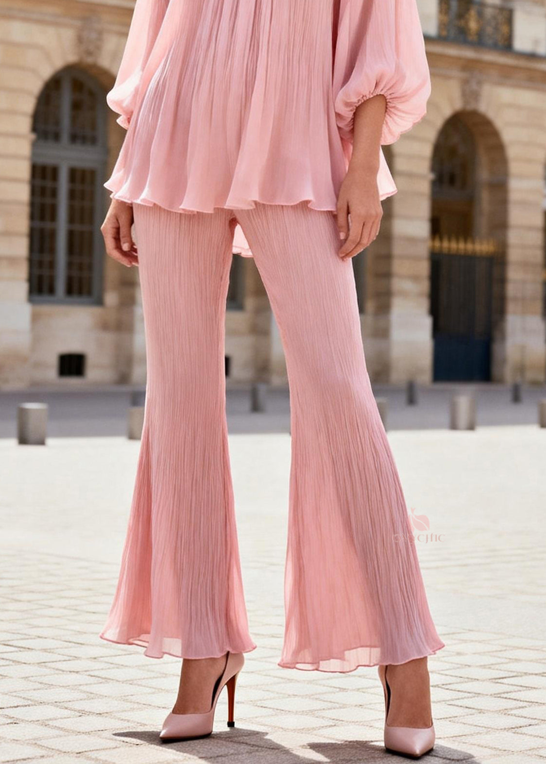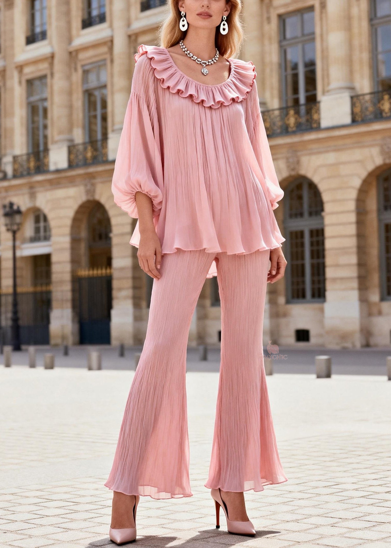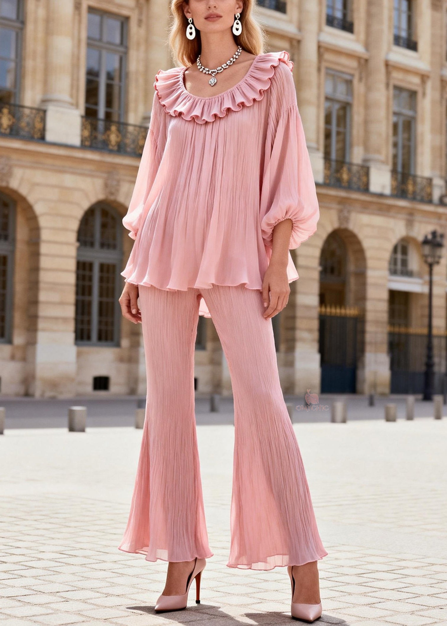 French Pink Ruffled Patchwork Chiffon Shirts And Flared Trousers Two Pieces Set Lantern Sleeve