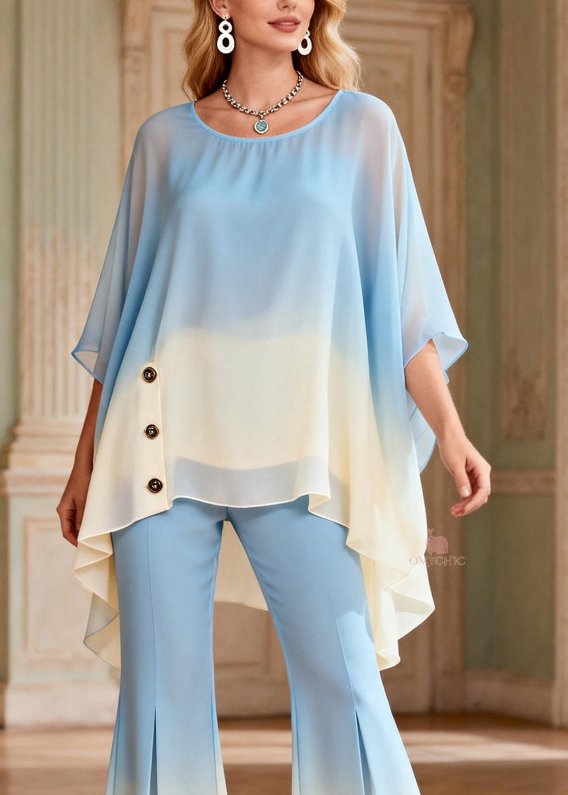 Gradient Color V Neck Patchwork Tunic Chiffon Shirts And Flared Trousers Two Pieces Set Spring