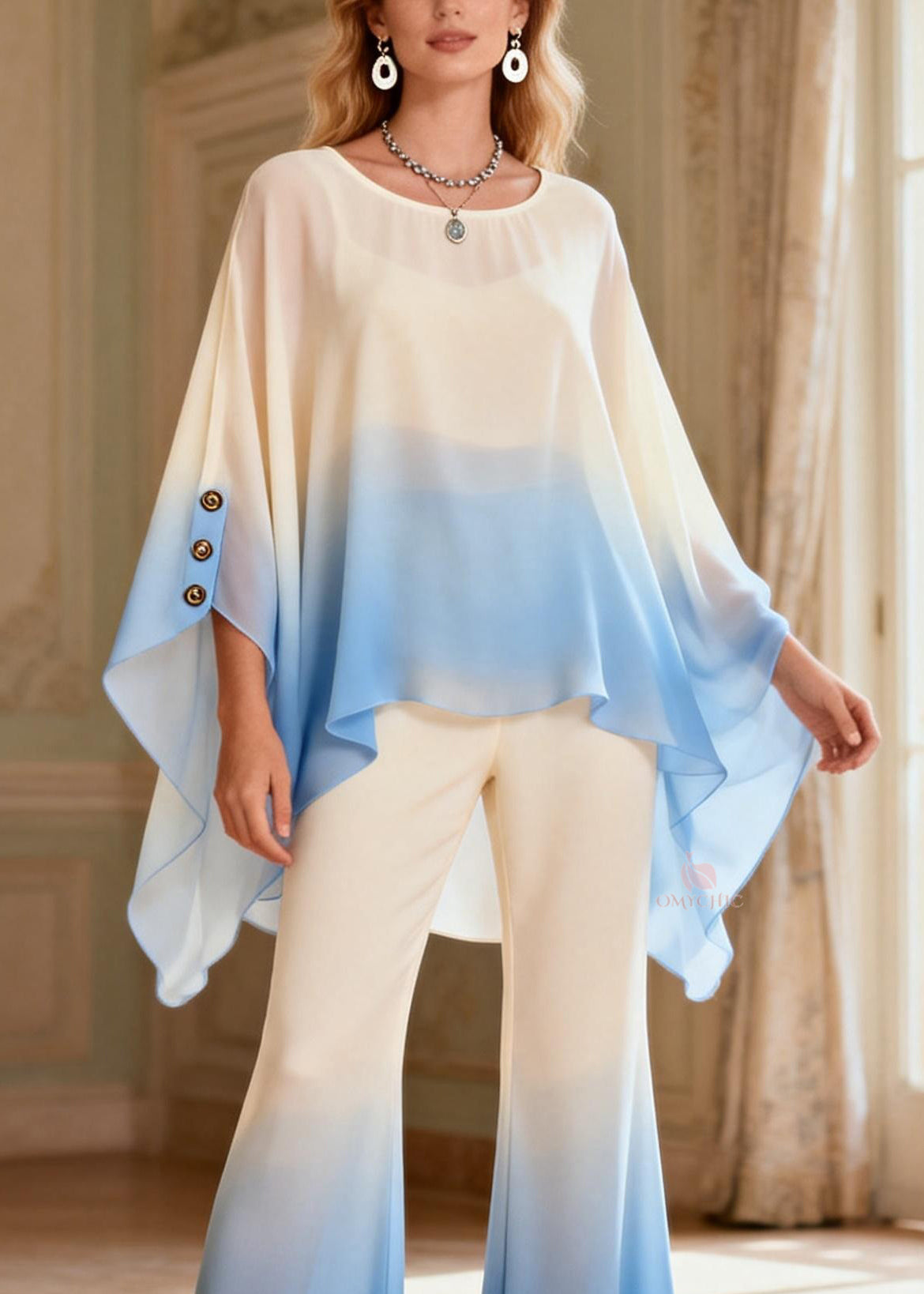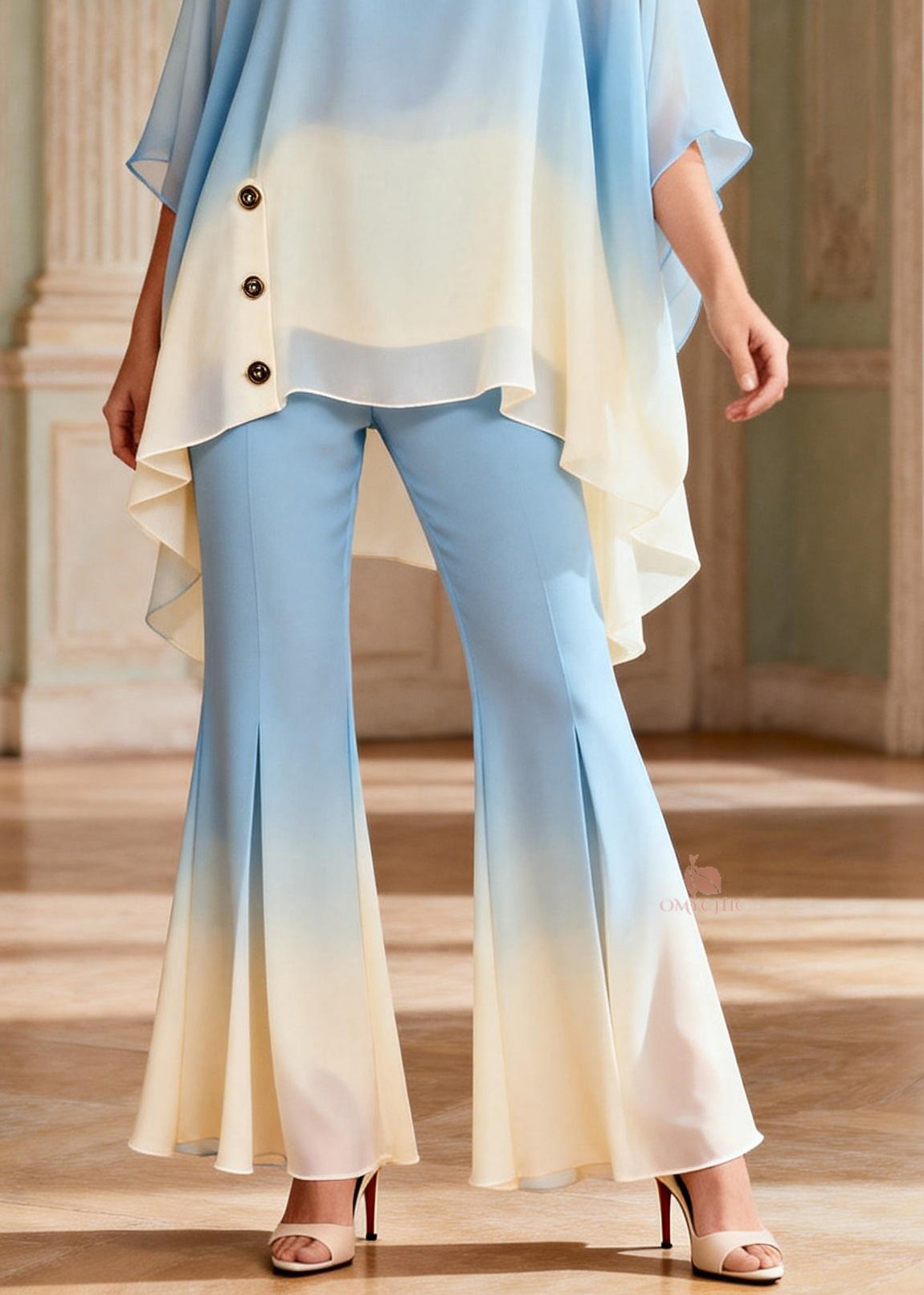 Gradient Color Slash Neck Chiffon Top And Flared Trousers Two-Piece Set Lantern Sleeve