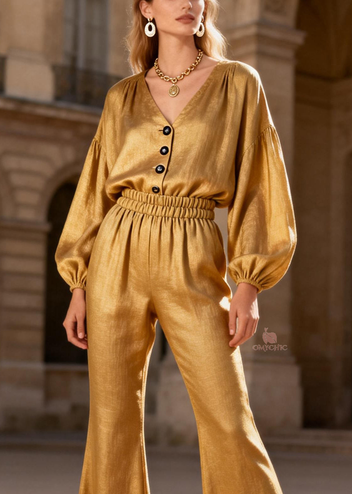 Cute Yellow V Neck Button Patchwork Chiffon Shirts And Flared Trousers Two Pieces Set Spring