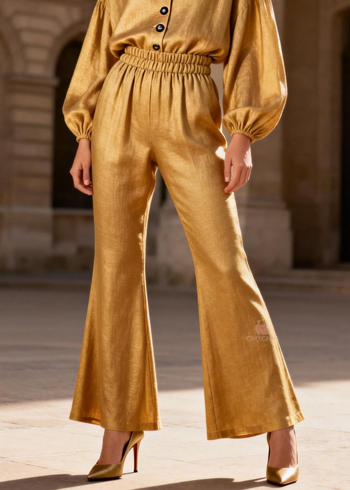 Elegant Yellow O-Neck Rivet Chiffon Top And Flared Trousers Two Piece Set Flare Sleeve