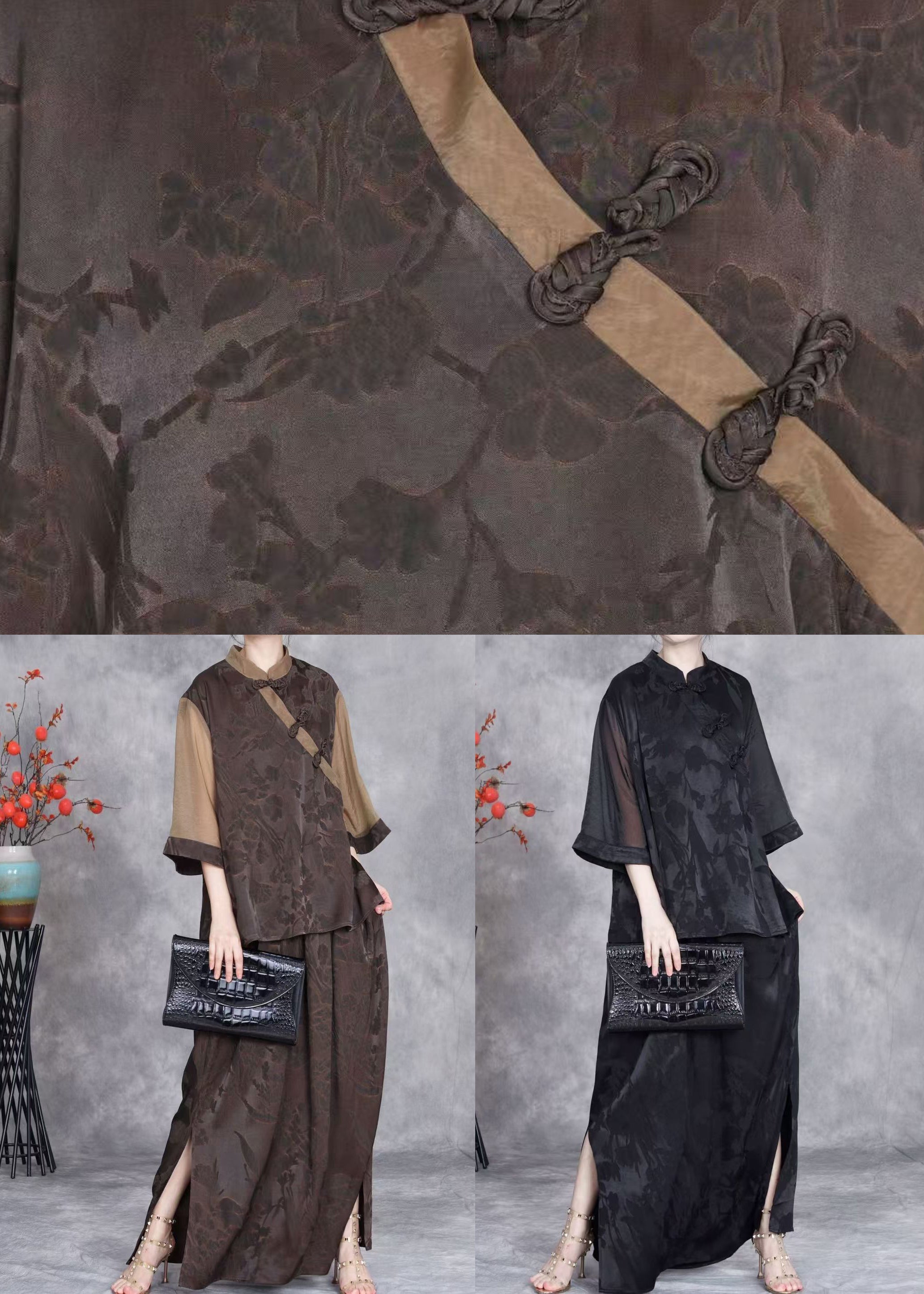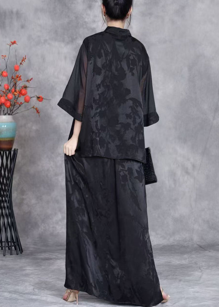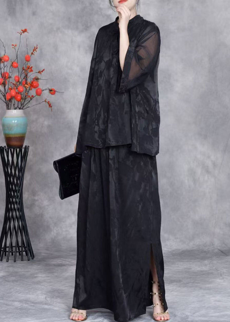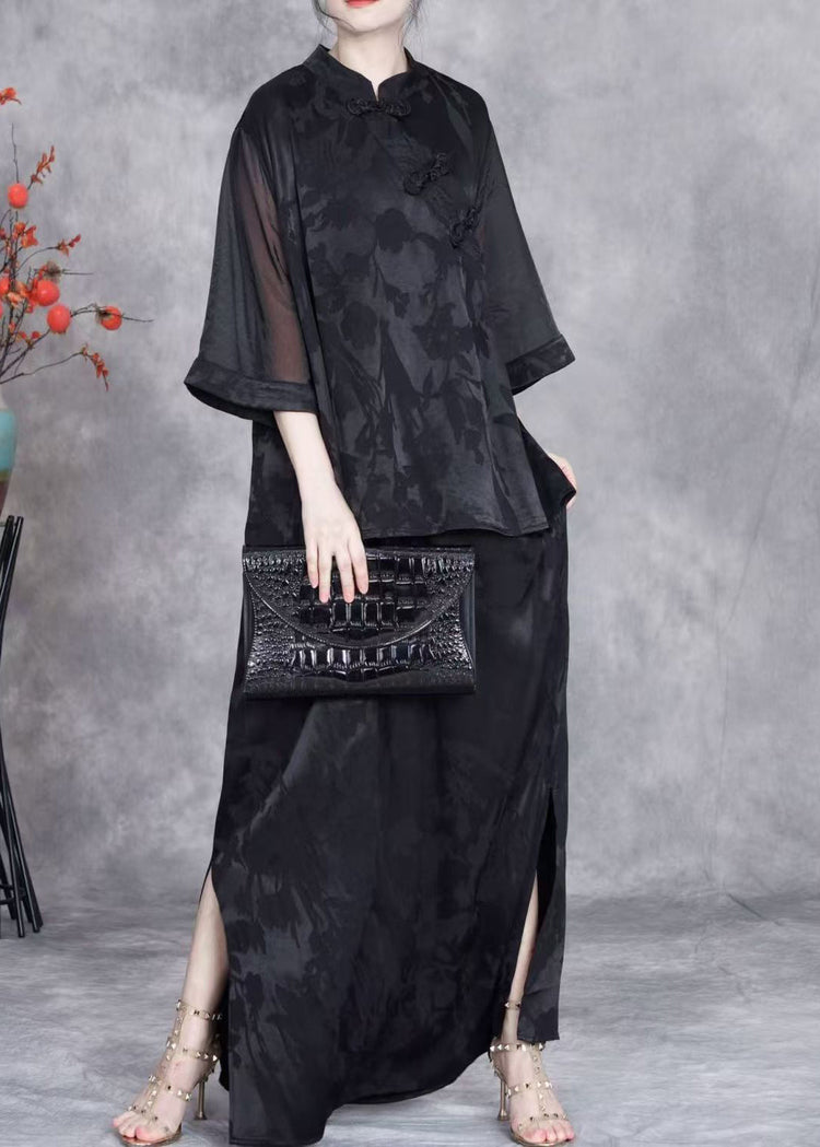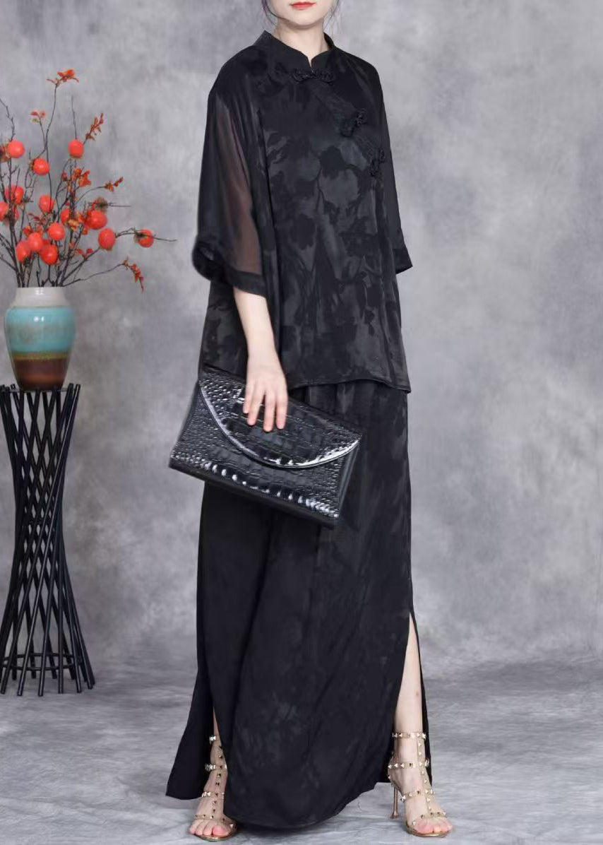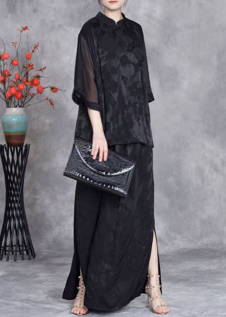 Black Jacquard Side Open Silk Two Piece Suit Set Stand Collar Half Sleeve