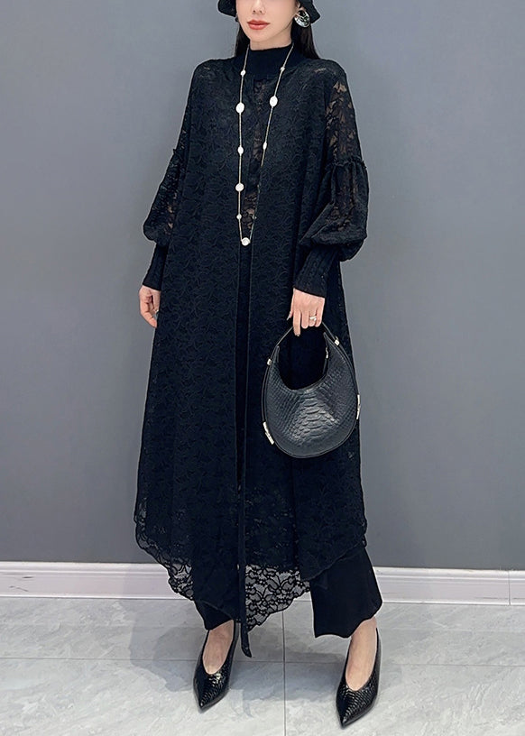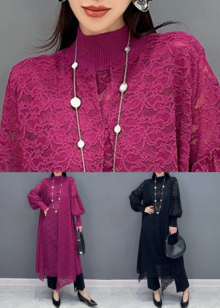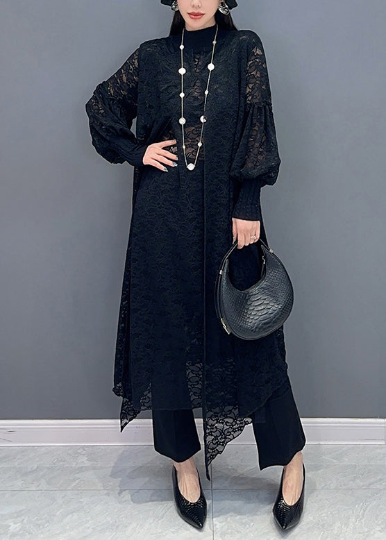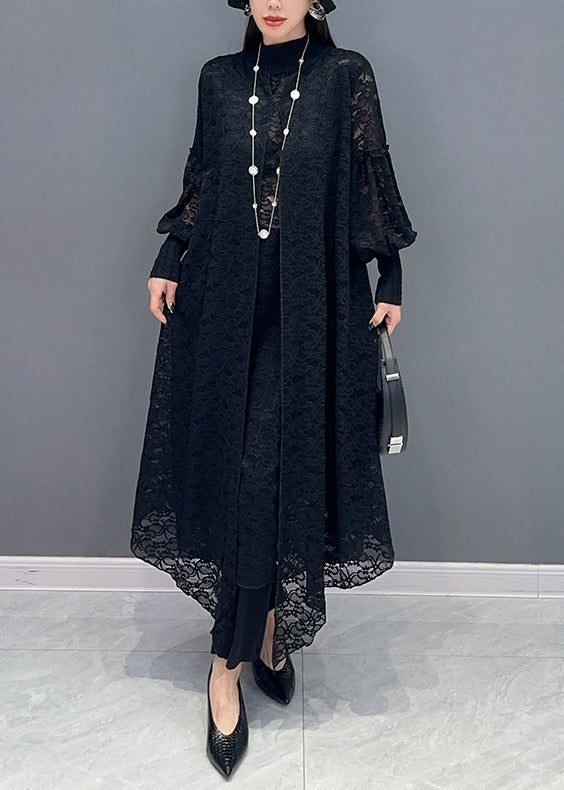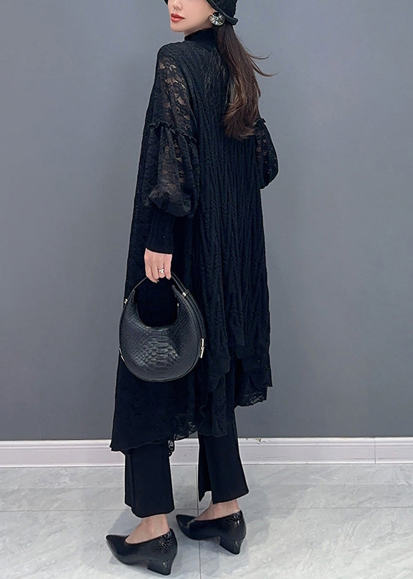 Black Knit Patchwork Lace Long Dress Asymmetrical Long Sleeve