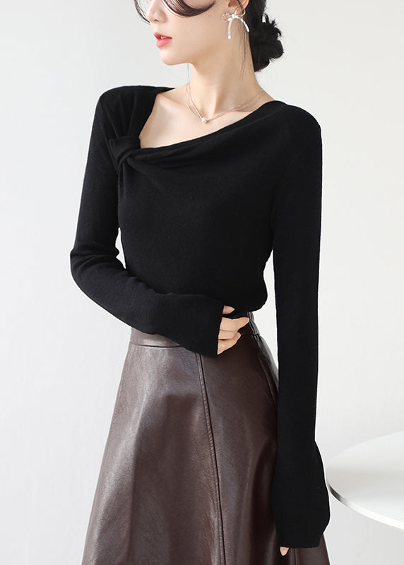 Black Knit Top Asymmetrical Wrinkled Slash Neck Spring