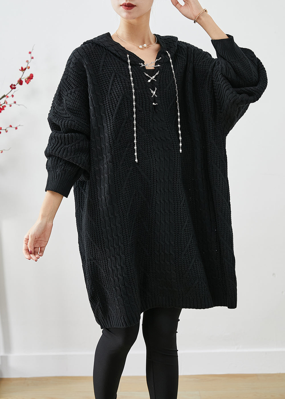 Black Loose Knit Long Sweater Dress Hooded Fall
