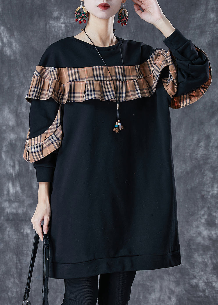 Black Loose Patchwork Cotton Sweatshirt Dress Ruffled Fall