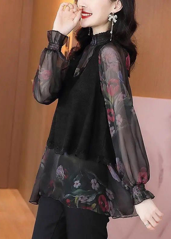 French Black Print Lace Patchwork False Two Pieces Top Long Sleeve