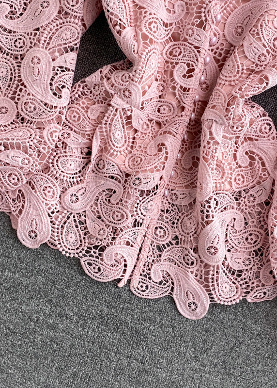 French Blue O-Neck Hollow Out Tunitc Lace Top Long Sleeve