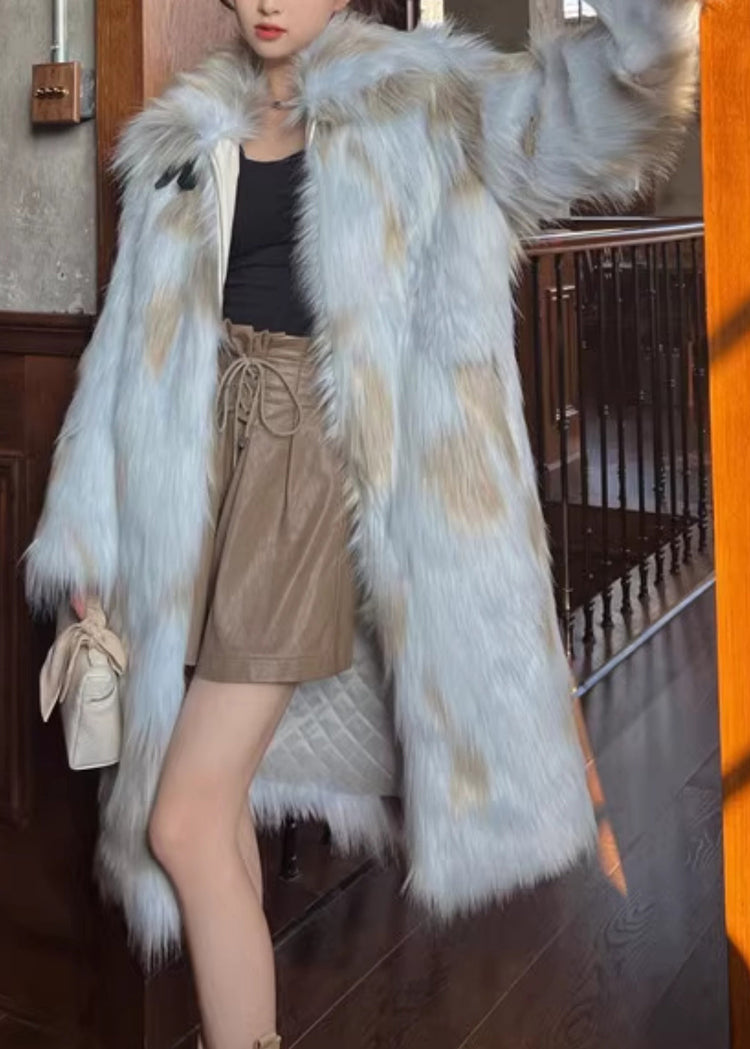 French Blue Pockets Leather And Fur Maxi Coats Winter