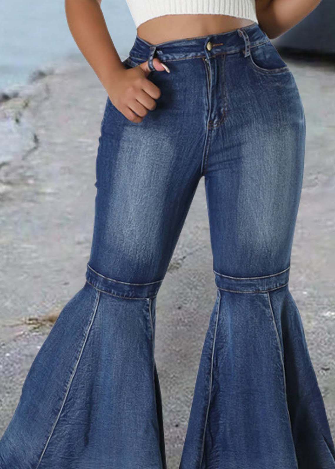 French Blue Ruffles Patchwork Denim Bell-bottom Trousers Summer