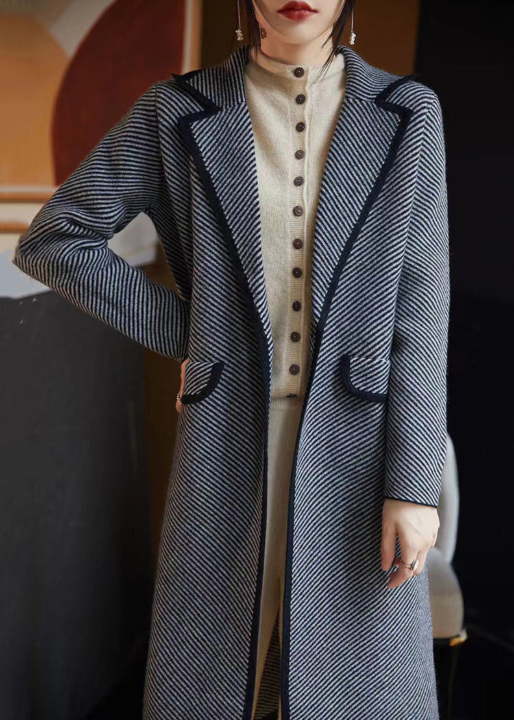 French Blue Striped Pockets Woolen Coats Fall