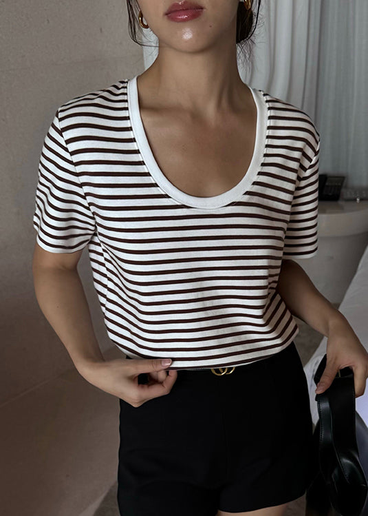 French Blue U Neck Striped Cotton T Shirt Tops Summer