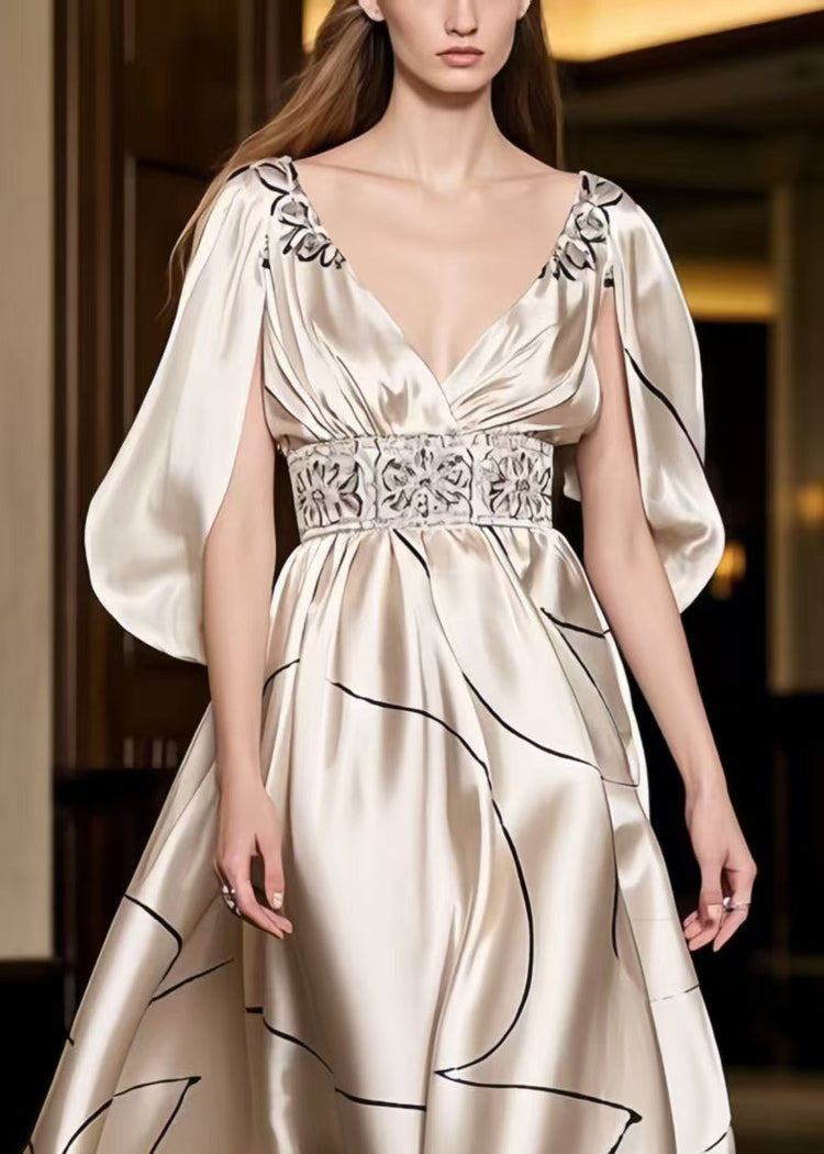 French Champagne Print Exra Large Hem Party Dress Cloak Sleeves