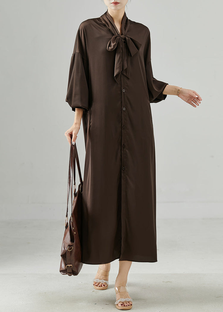 French Chocolate Lace Up Draping Silk Shirt Dresses Spring