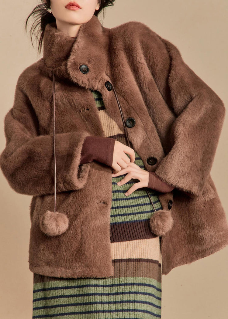French Coffee Button Lace Up Pockets Fluffy Coats Winter