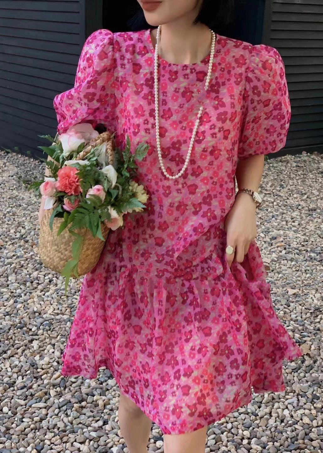 French Coffee Print Lace Up Chiffon Dress Puff Sleeve