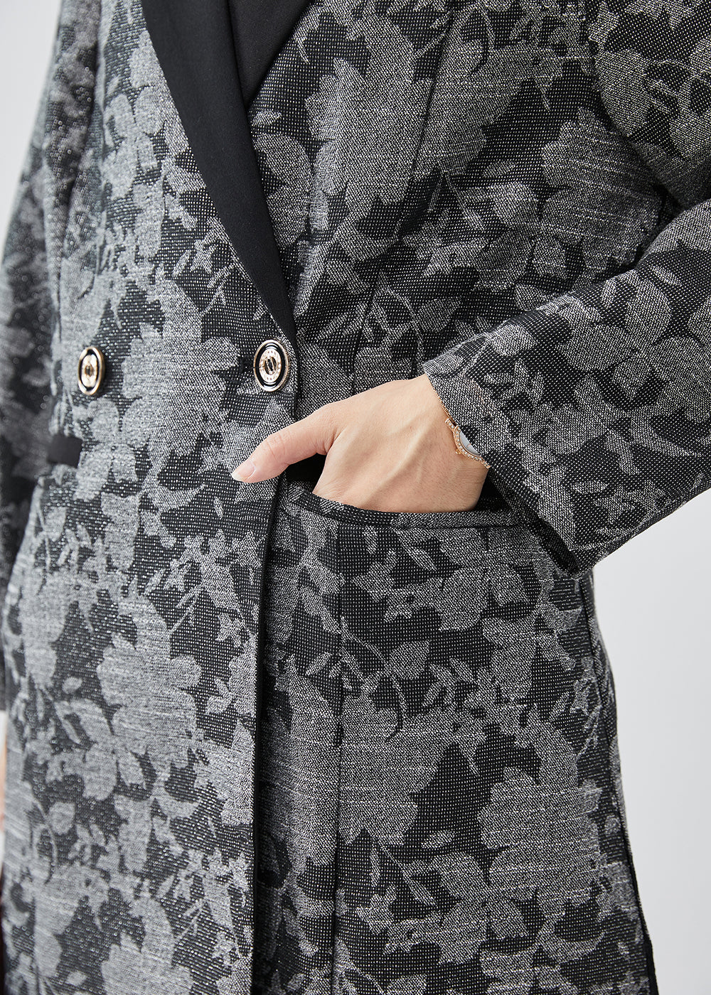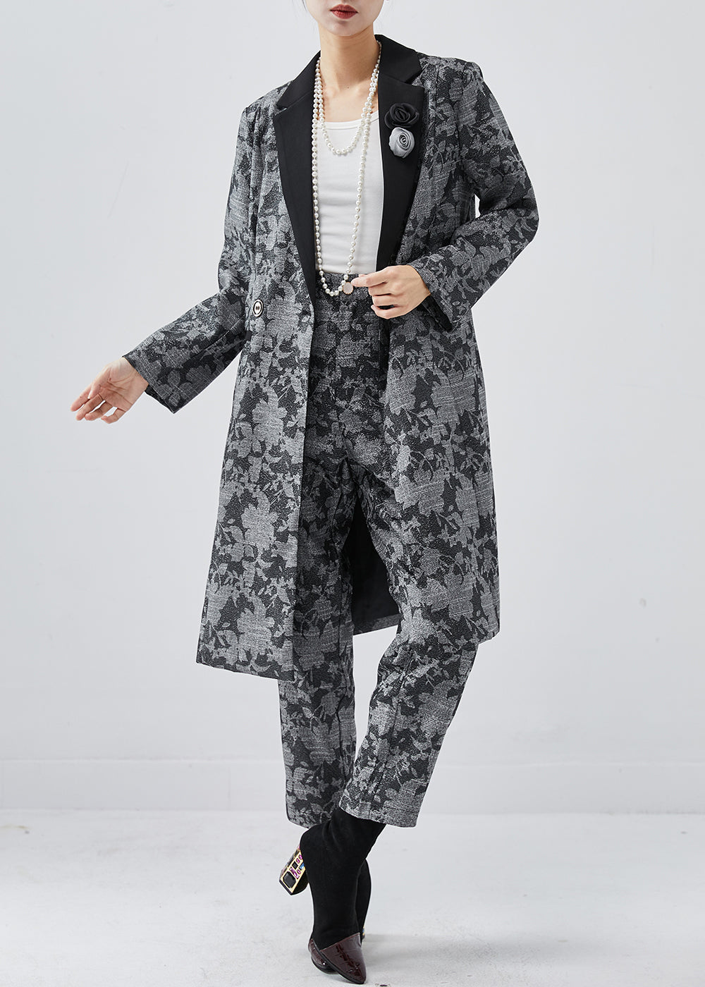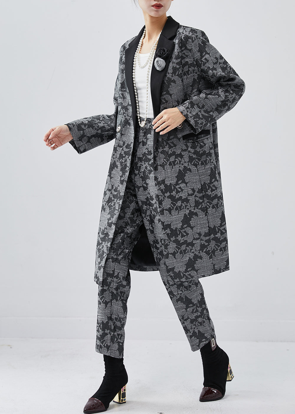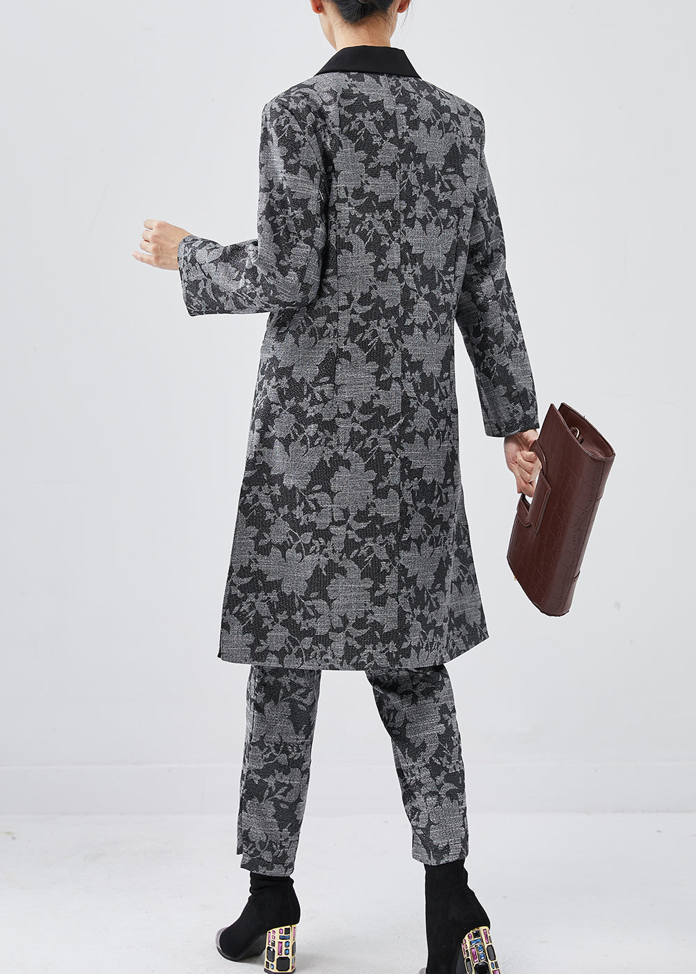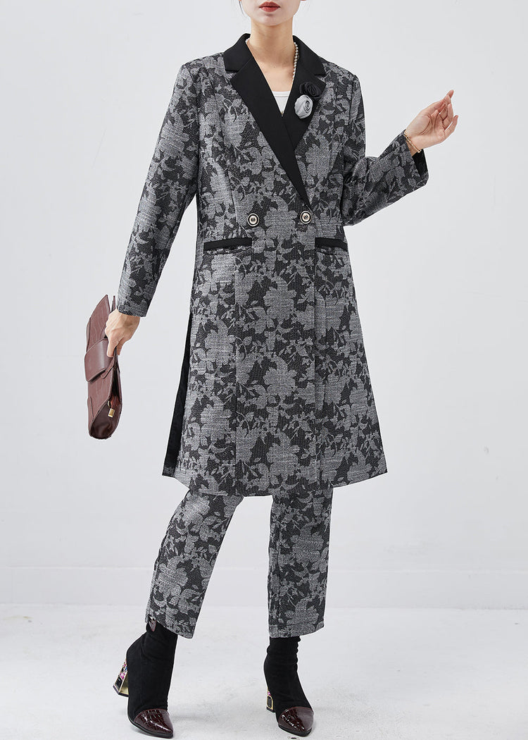 French Dark Grey Peter Pan Collar Floral Cotton Two Pieces Set Spring