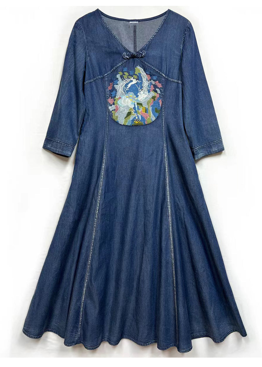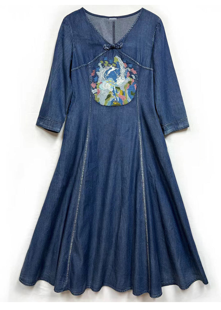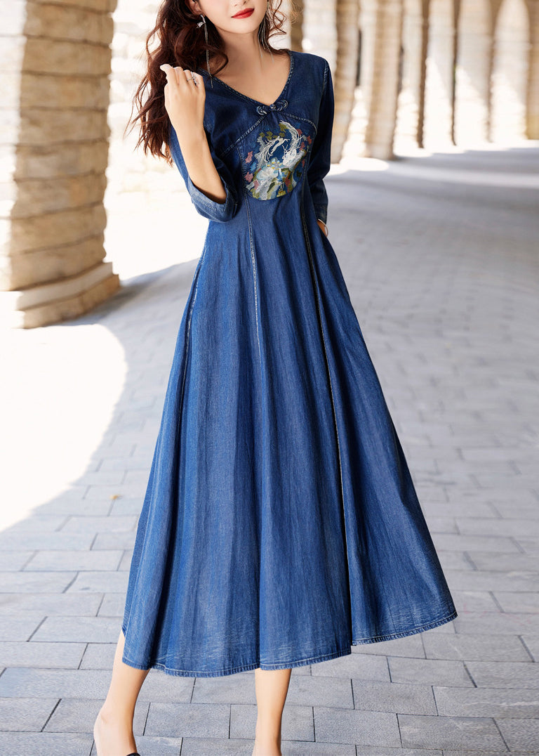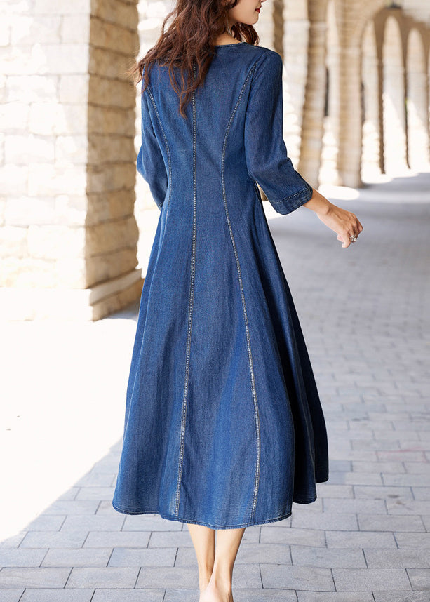 French Denim Blue V Neck Patchwork Pockets Maxi Dresses Spring