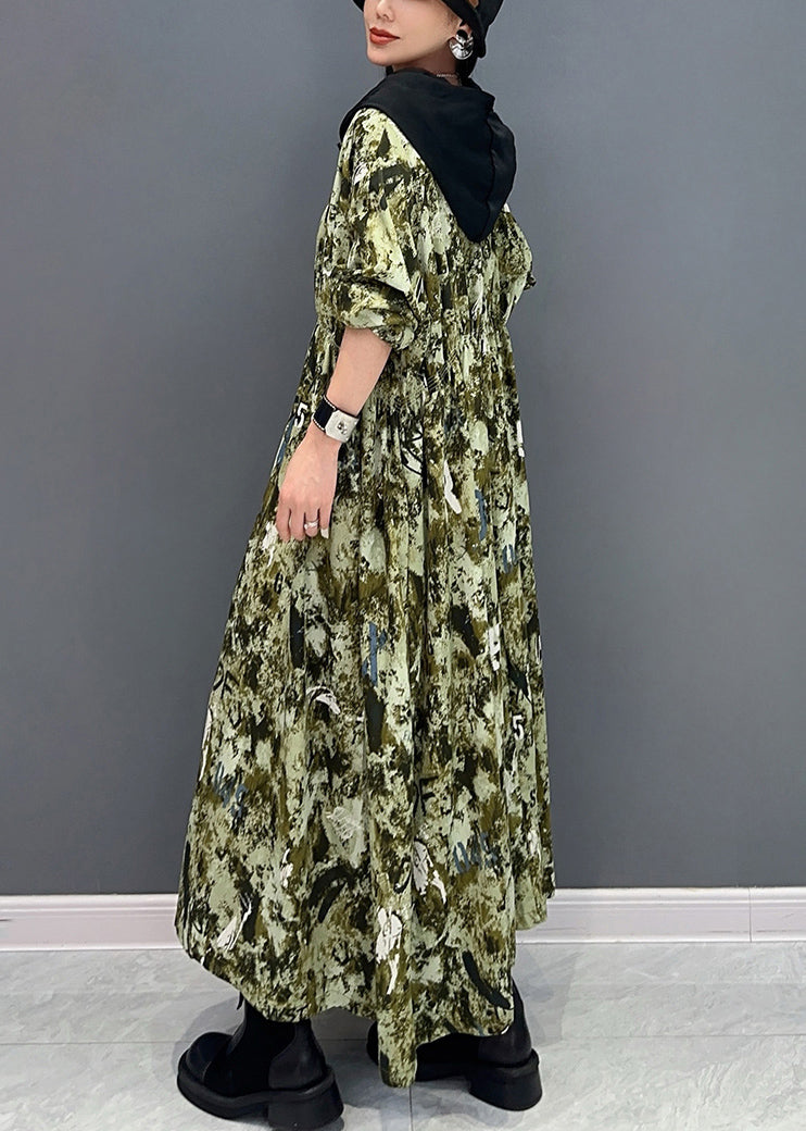 French Green Hooded Print Pockets Cotton Long Dress Summer