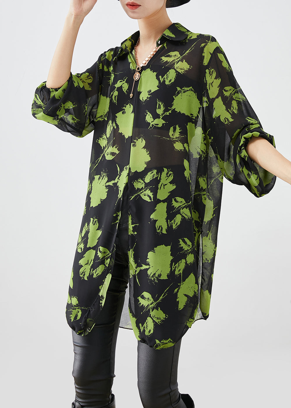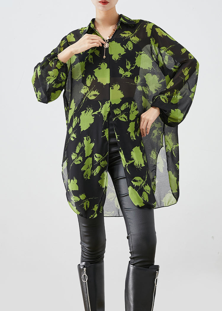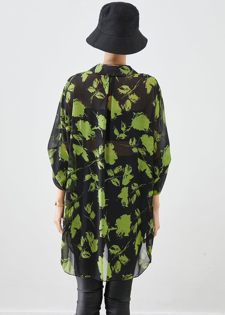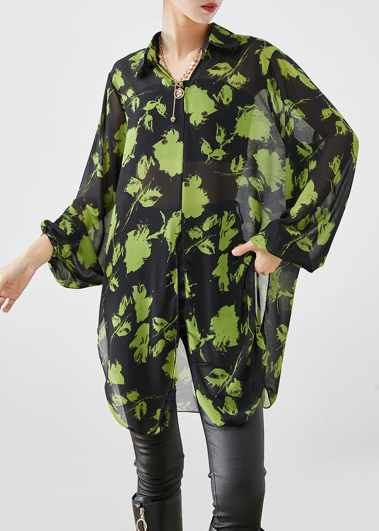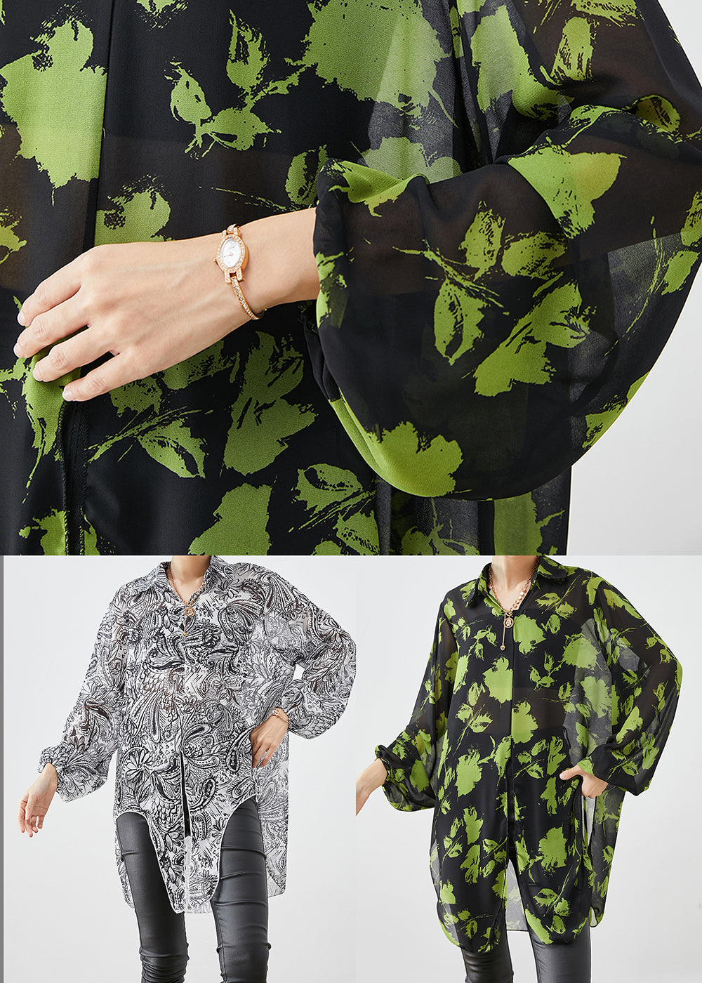 French Green Print Oversized Chiffon Blouses Lantern Sleeve