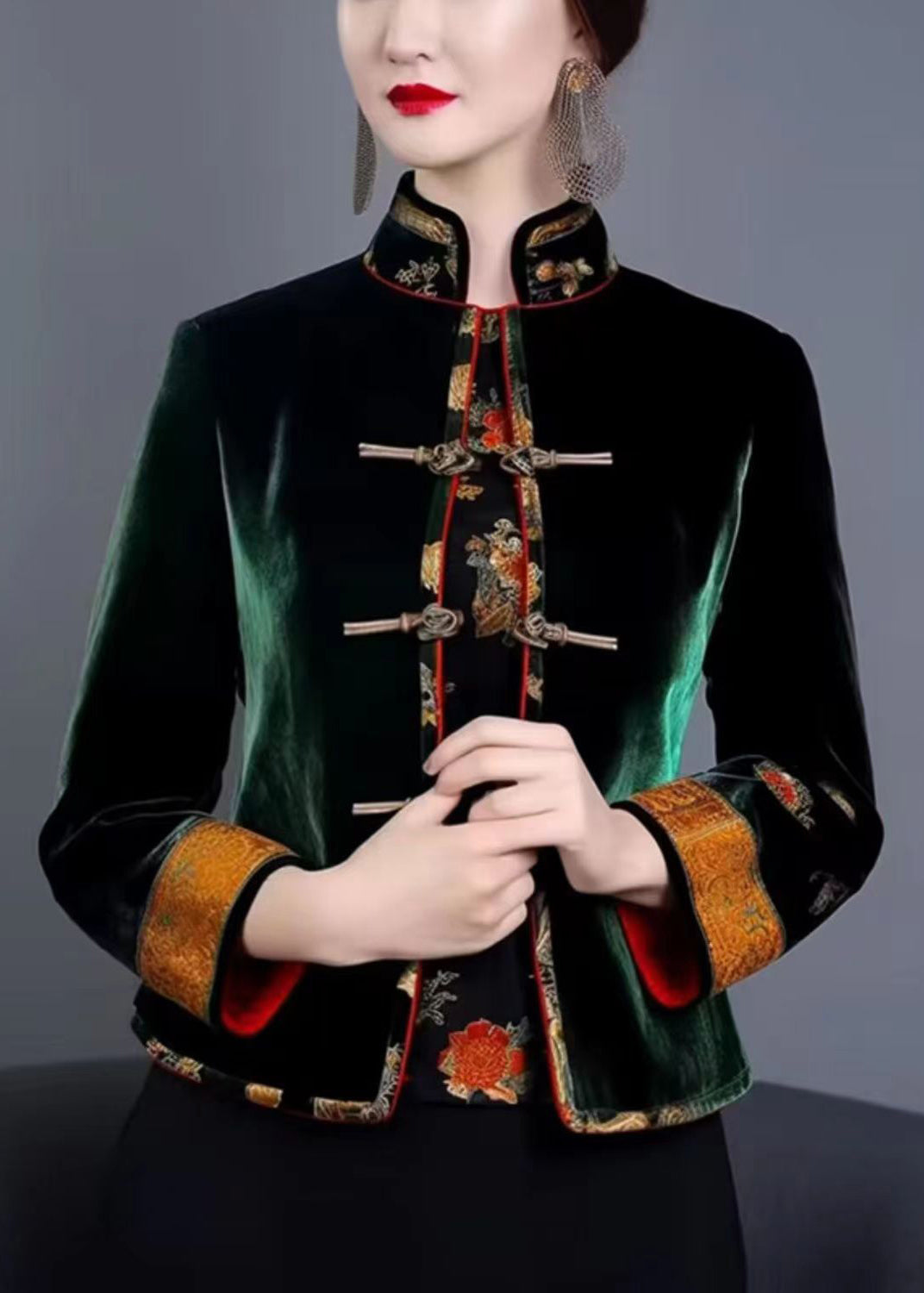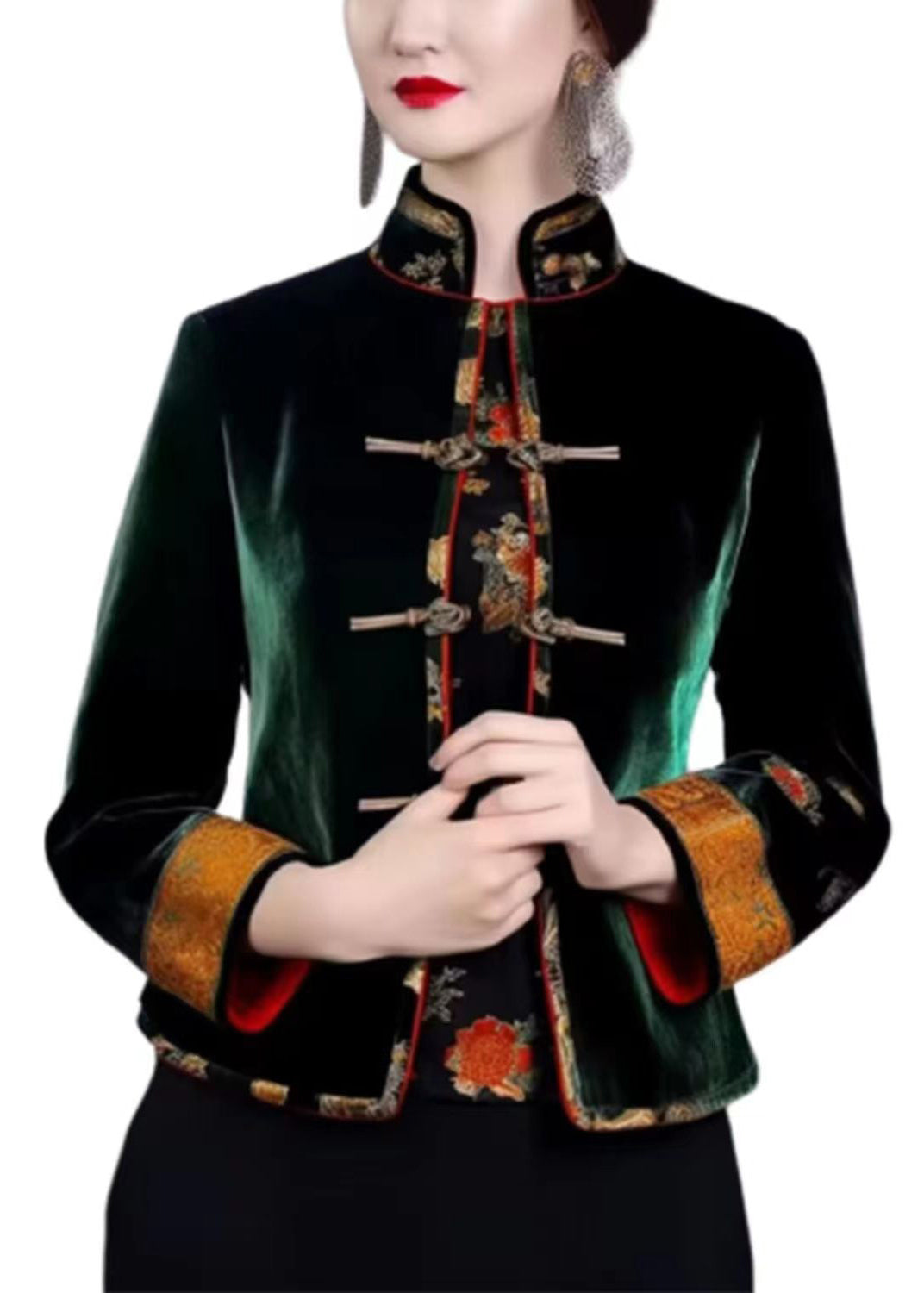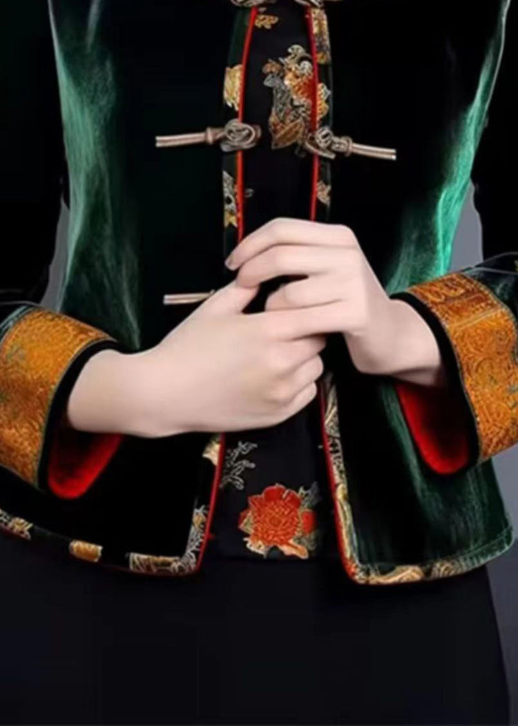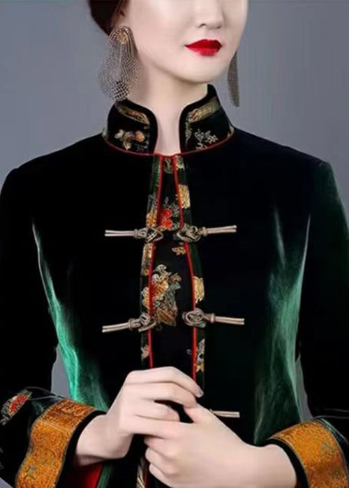 French Green Print Patchwork Warm Fleece Tops Long Sleeve