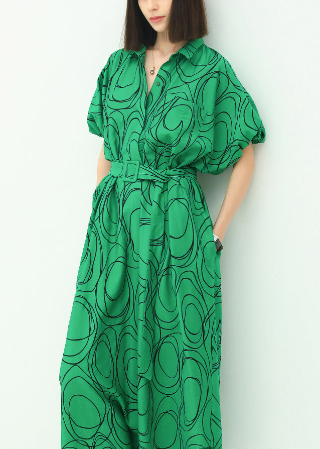 French Green Print Tie Waist Cotton Shirts Dresses Summer