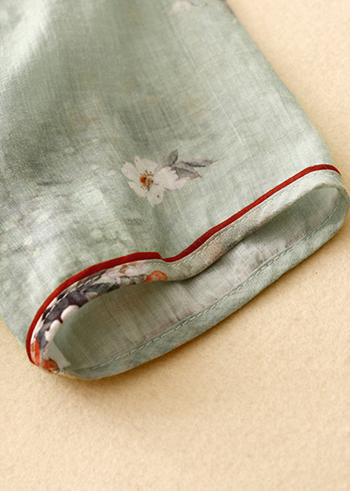 French Green Stand Collar Print Linen Blouses Half Sleeve
