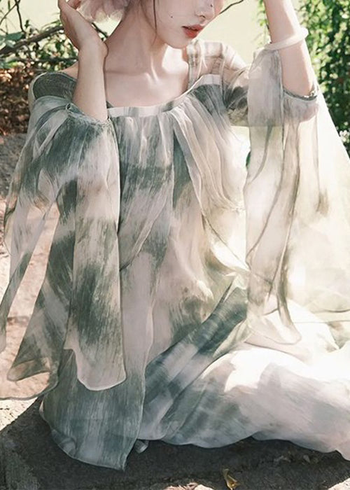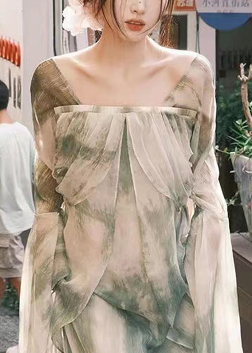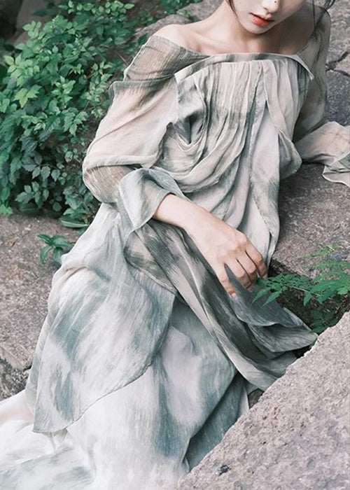 French Green Tie Dye Wrinkled Cotton Long Dresses Long Sleeve