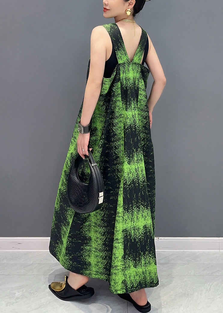 French Green V Neck Print Pockets Cotton Long Dress Sleeveless