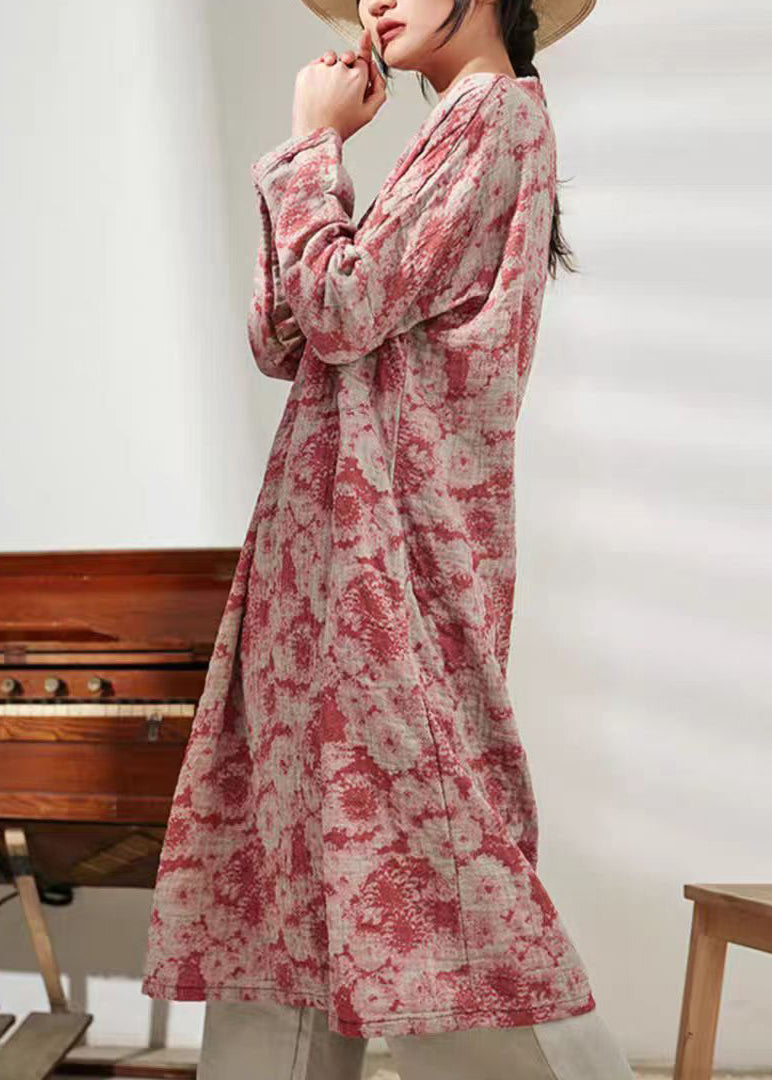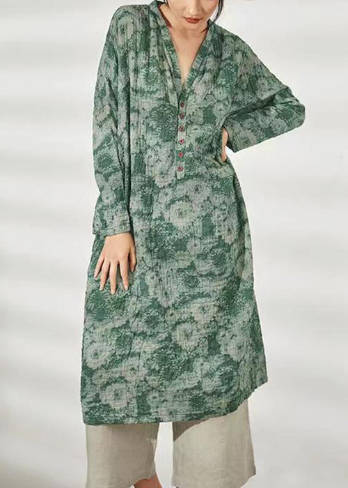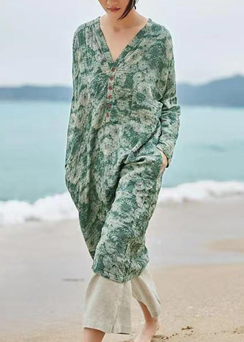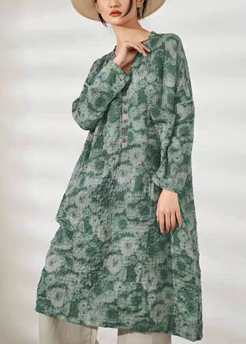French Green V Neck Print Pockets Cotton Long Dress Spring