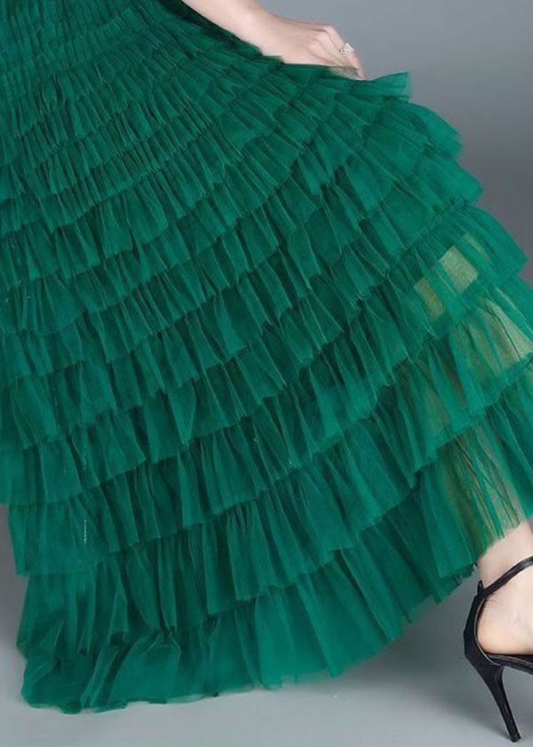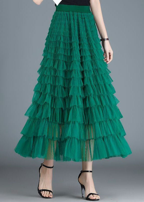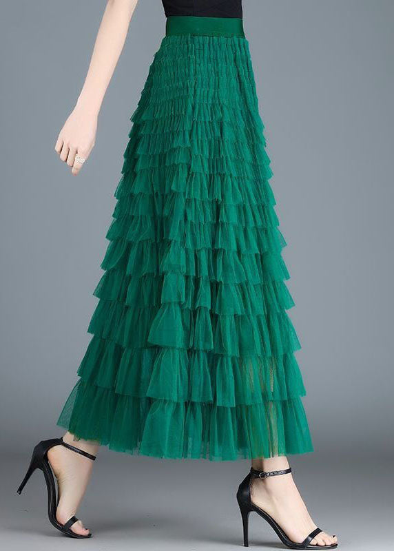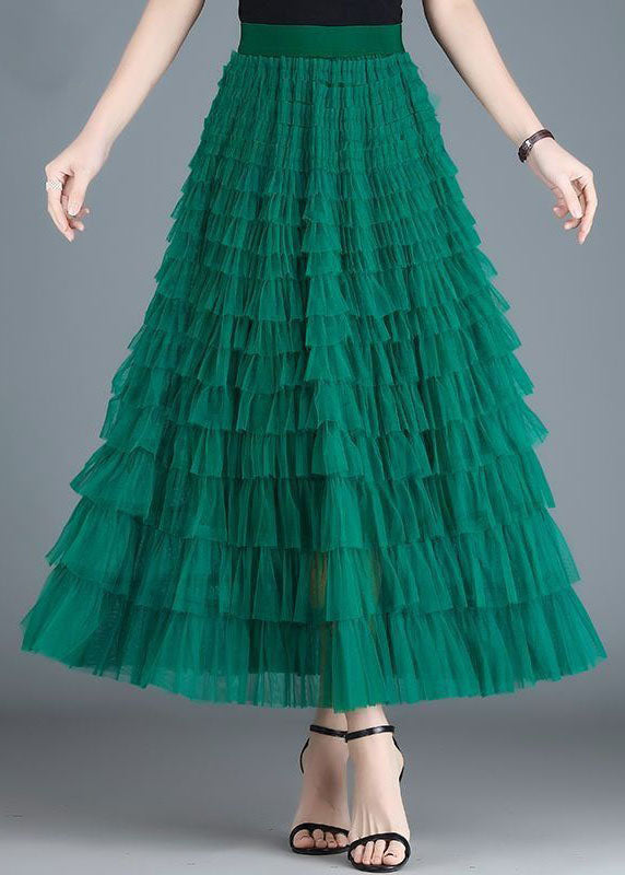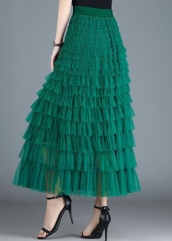 French Green Wrinkled Patchwork Elastic Waist Tulle Skirt Spring