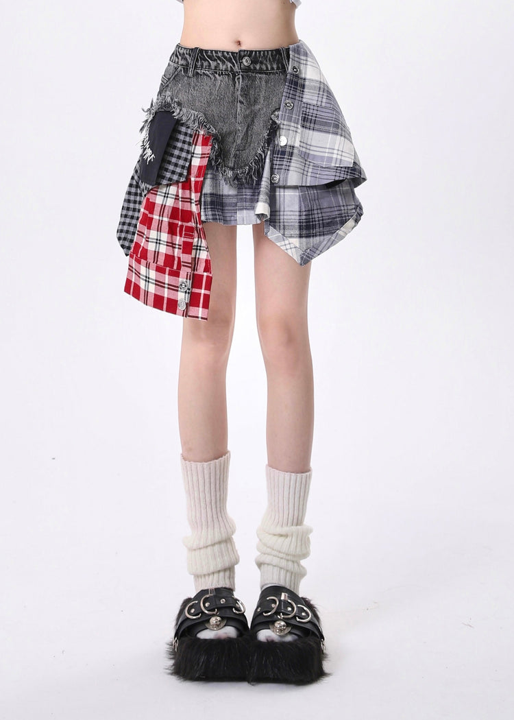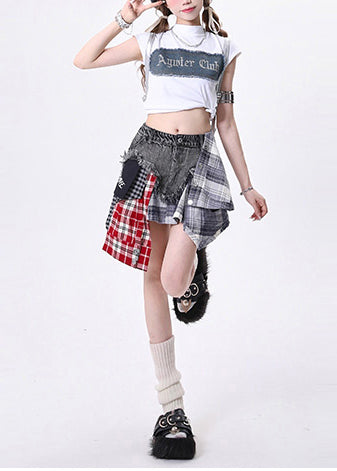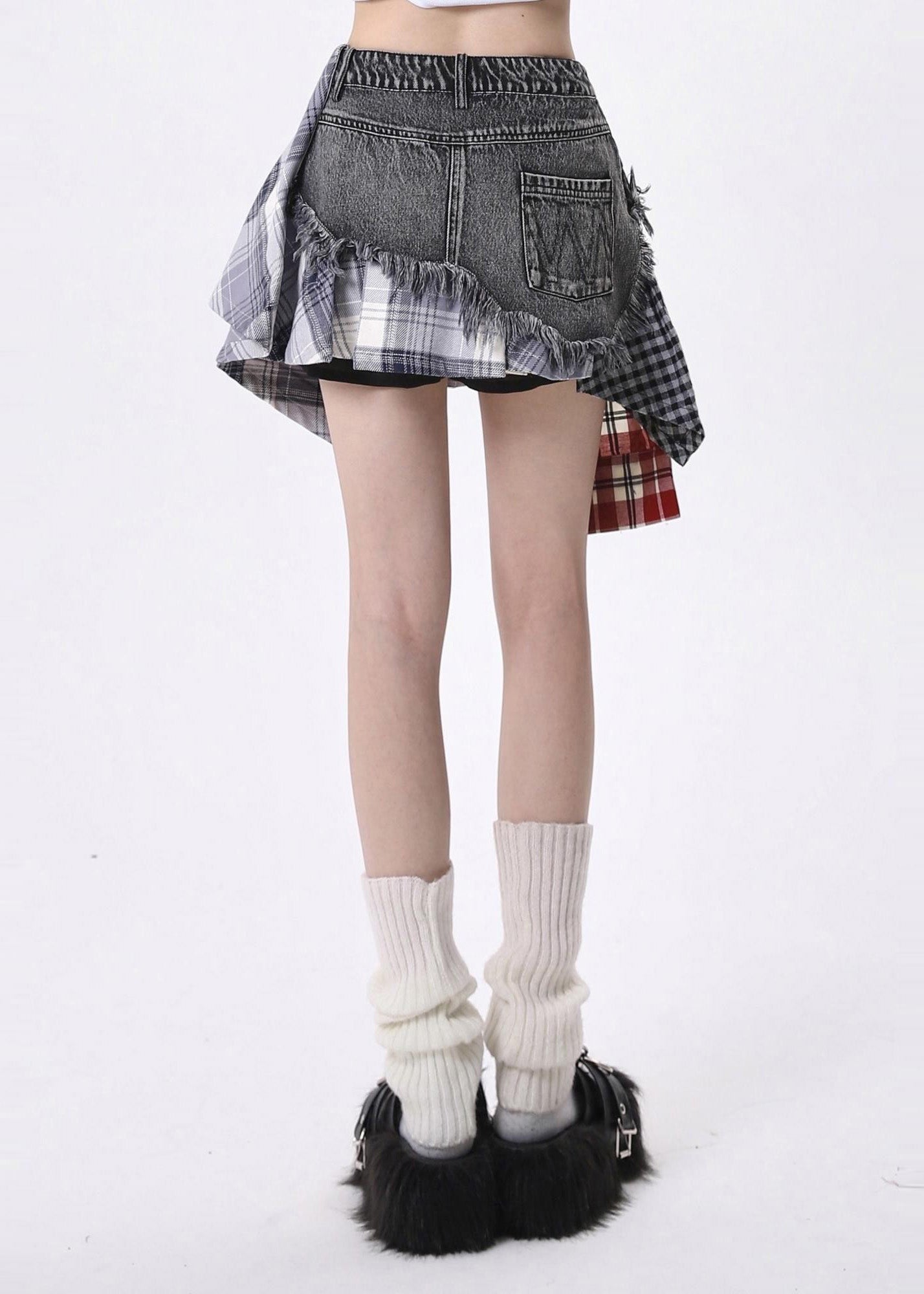 French Grey Asymmetrical Patchwork Denim Short Skirt Summer