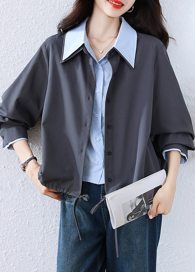 French Grey Button False Two Pieces Patchwork Cotton Blouses Fall