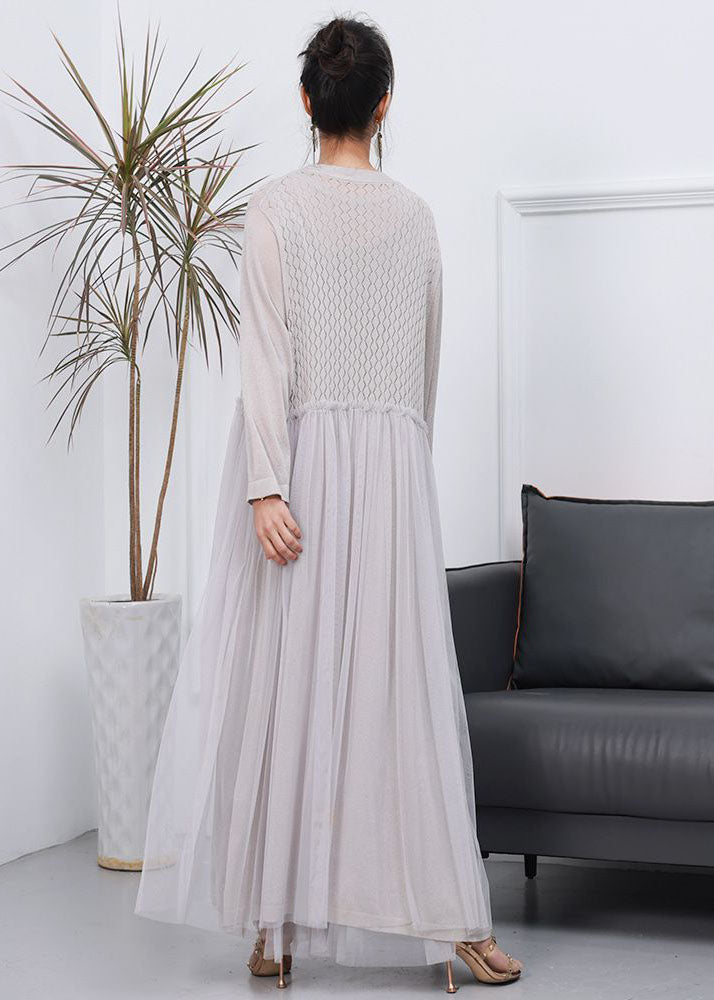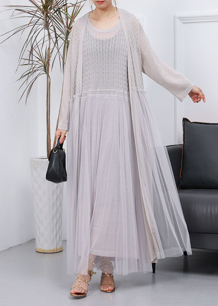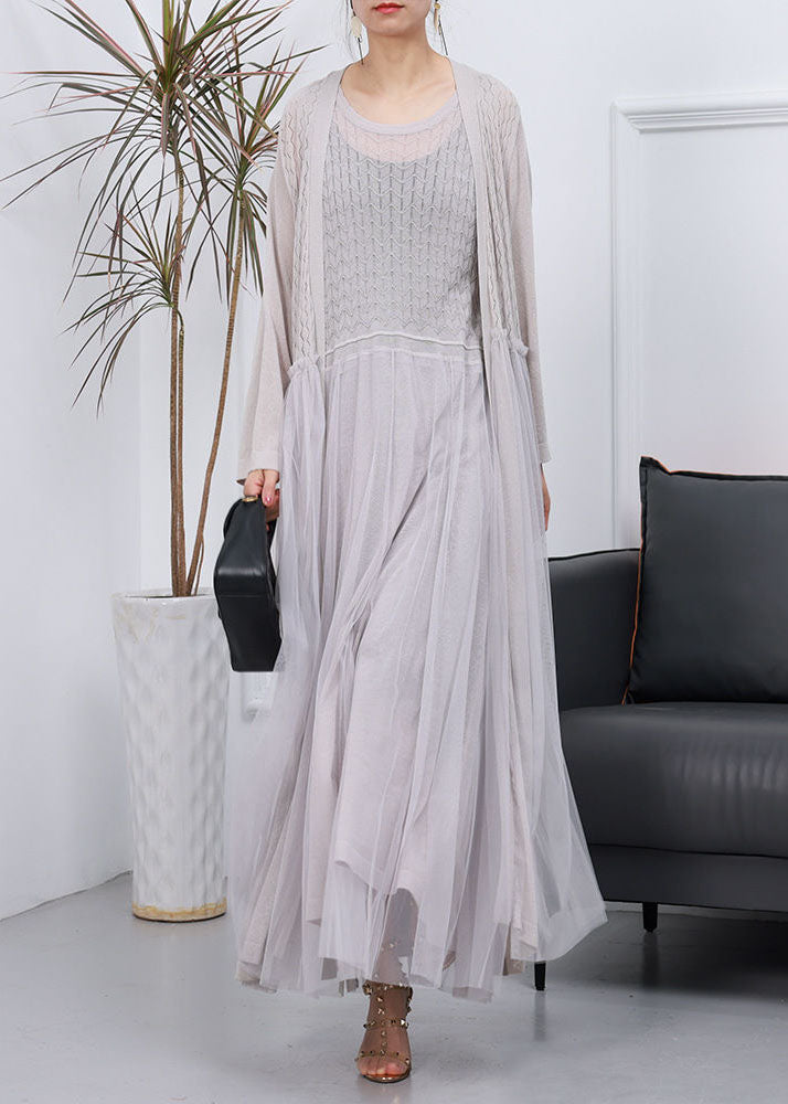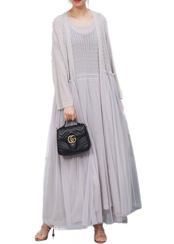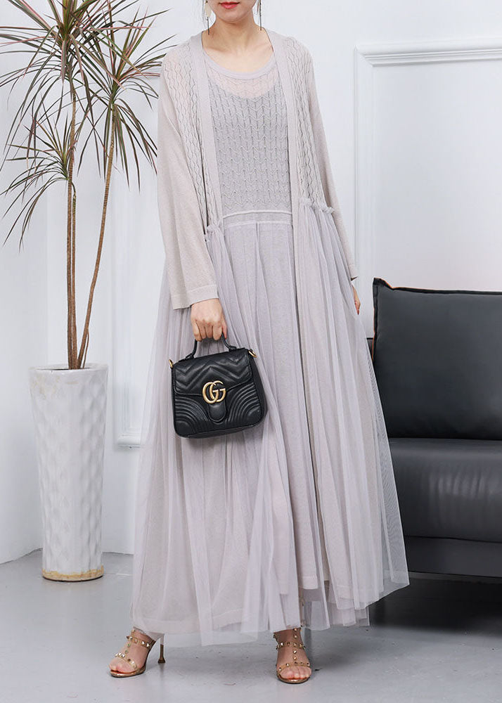 French Grey Knit Patchwork Cardigans And Dress Tulle Two Pieces Set Spring