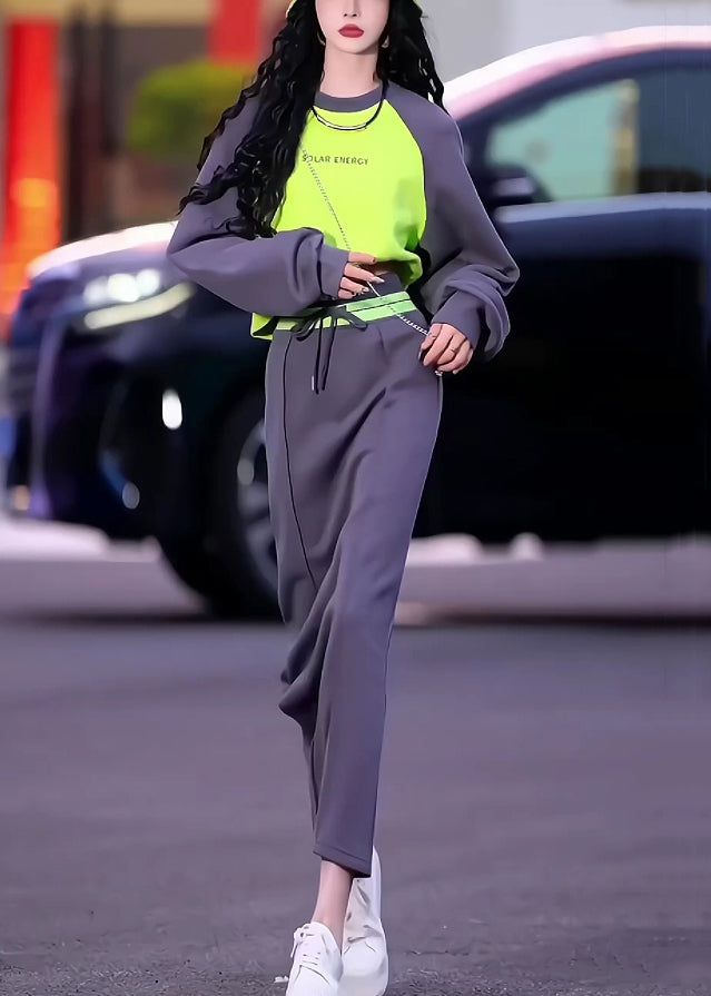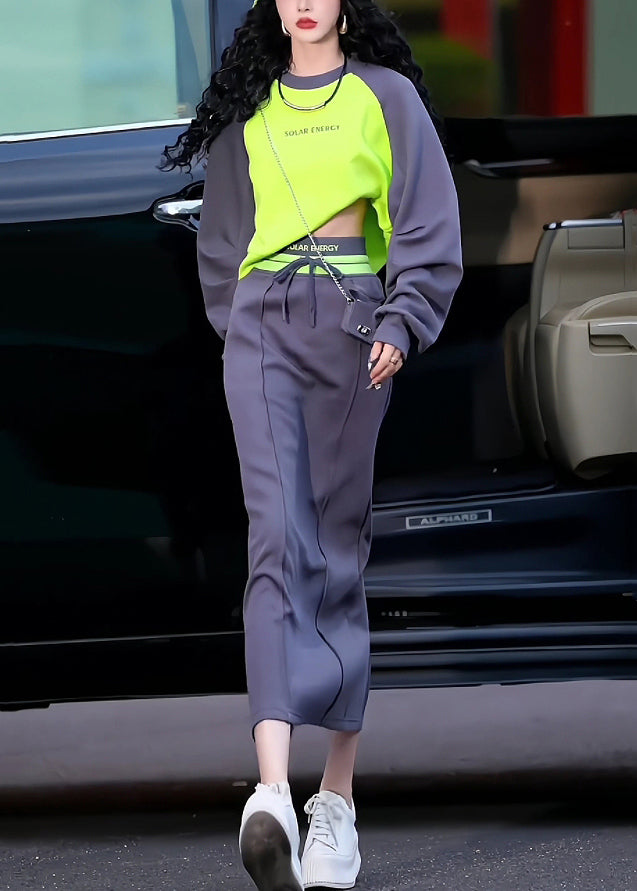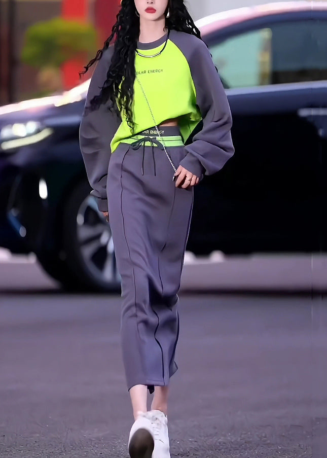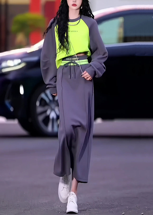 French Grey O Neck Patchwork Tops And Skirts Cotton Two-Piece Set Long Sleeve