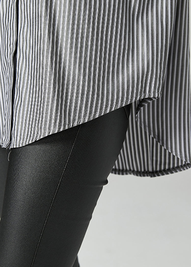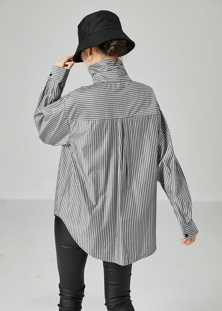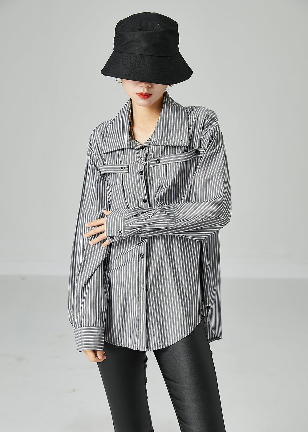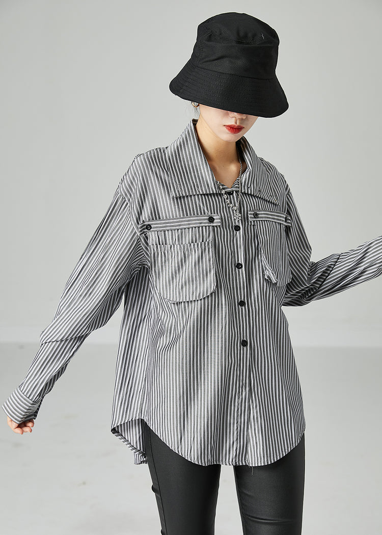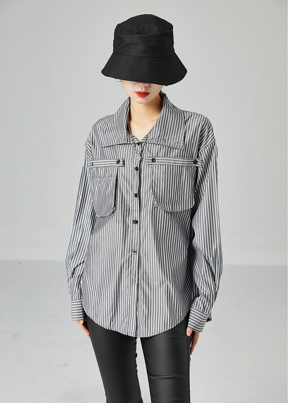 French Grey Peter Pan Collar Striped Pockets Cotton Shirt Spring