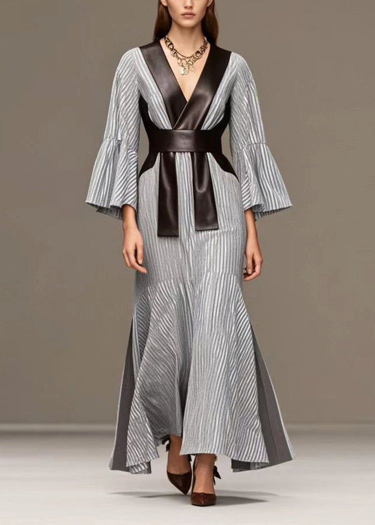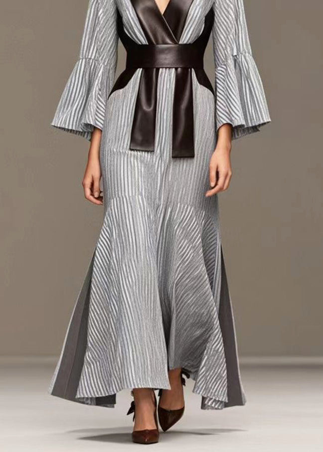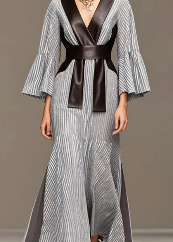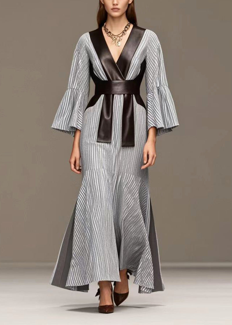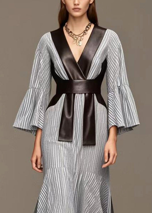 French Grey Striped Patchwork Faux Leather Side Open Full Dresses Fall