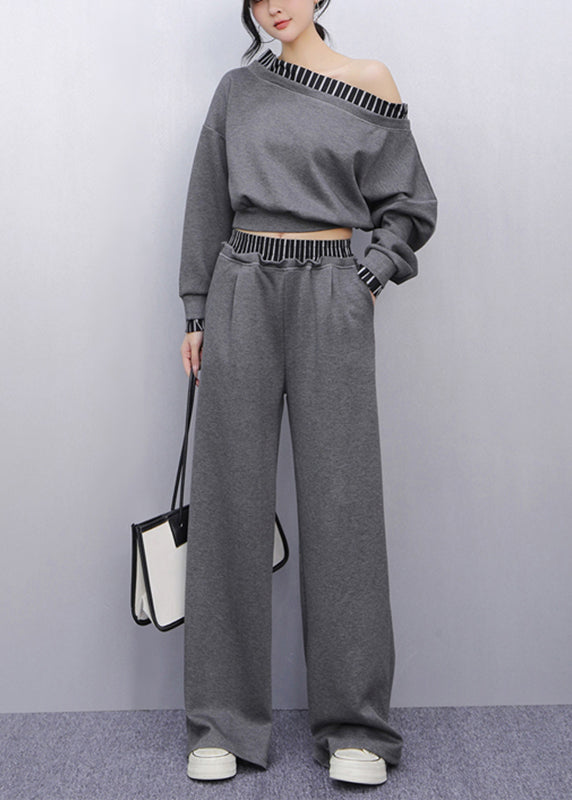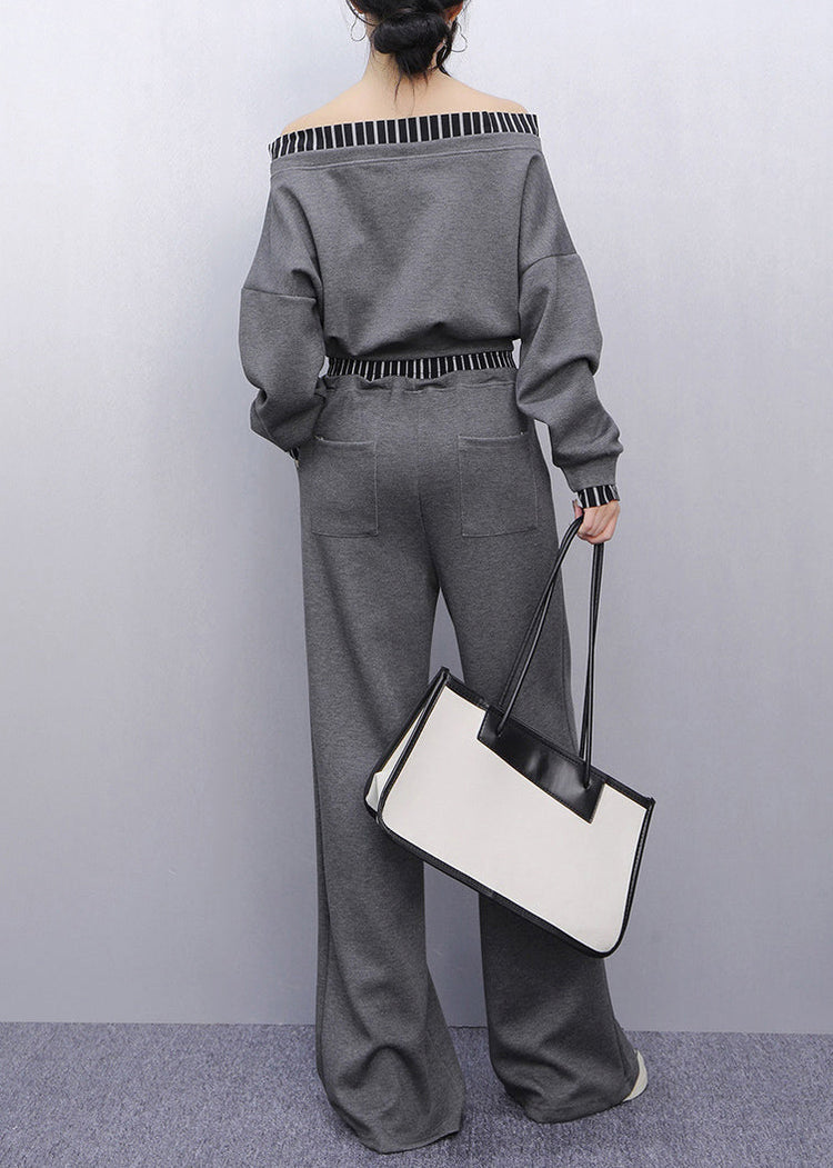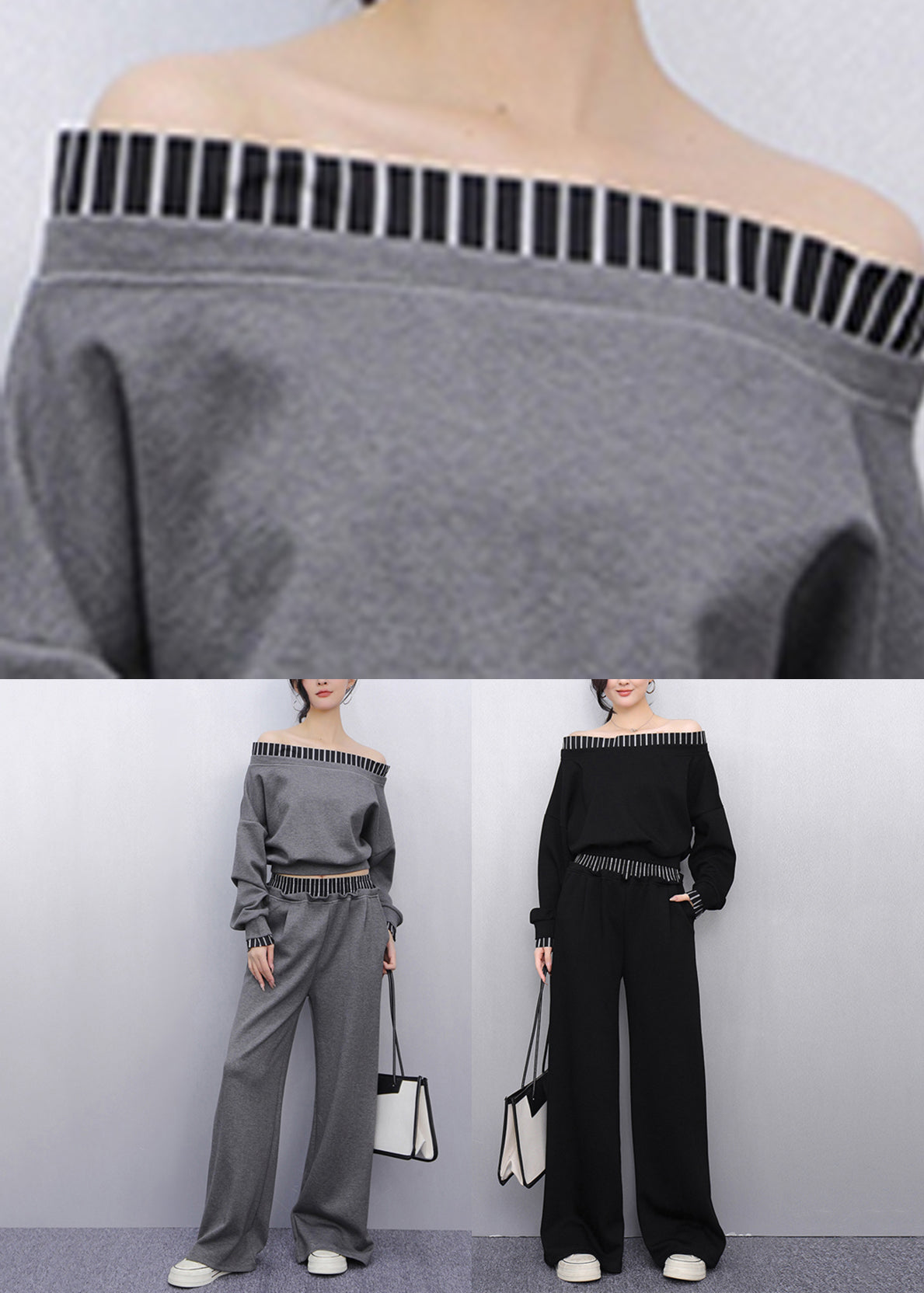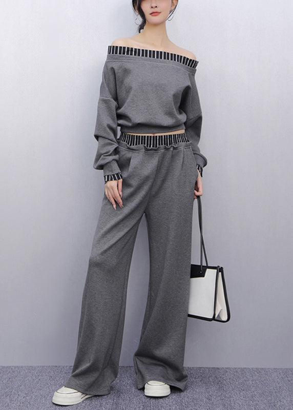 French Grey Striped Patchwork Top And Straight Pants Two Pieces Set Puff Sleeve