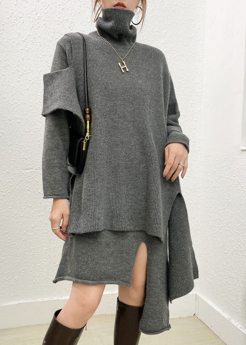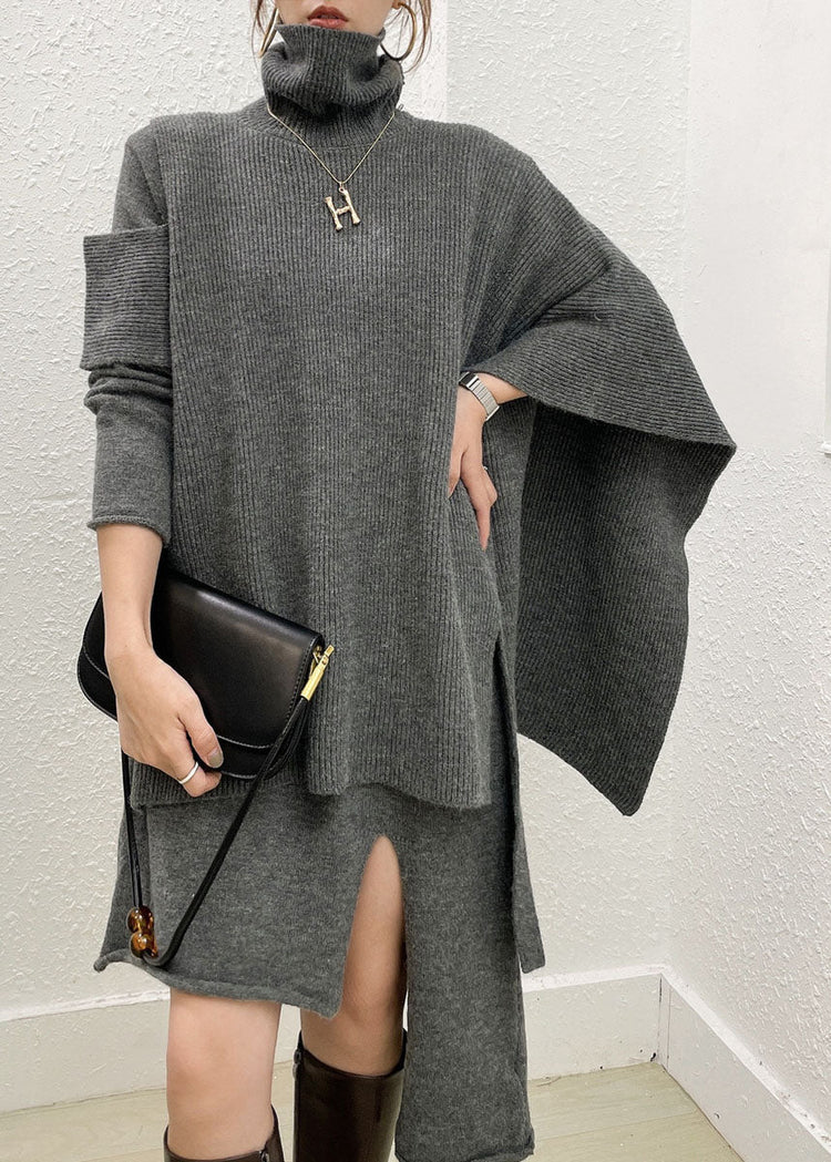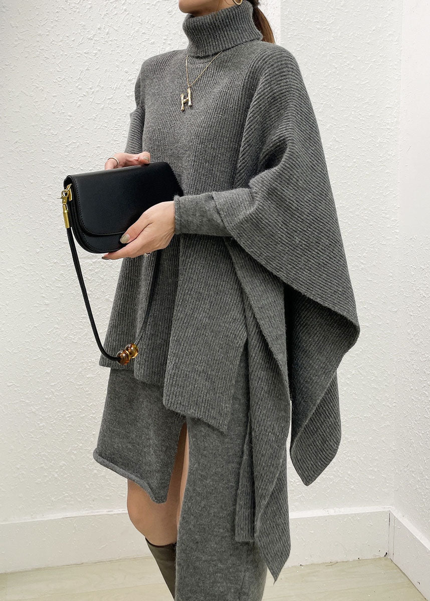 French Grey Turtle Neck Asymmetrical Knit Two Piece Set Outfits Cloak Sleeves