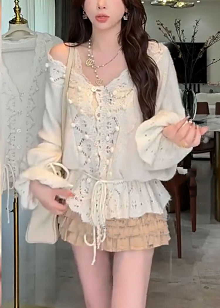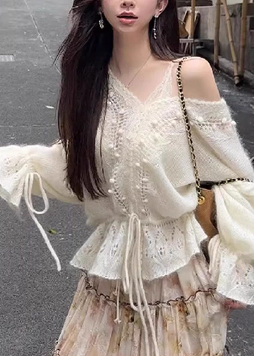 French Grey V Neck Hollow Out Drawstring Knit Top Autumn